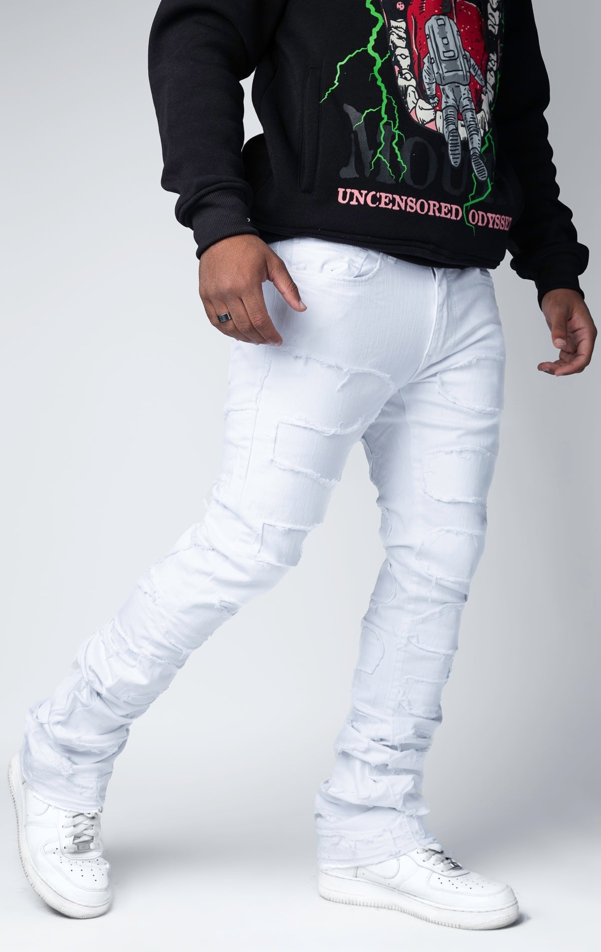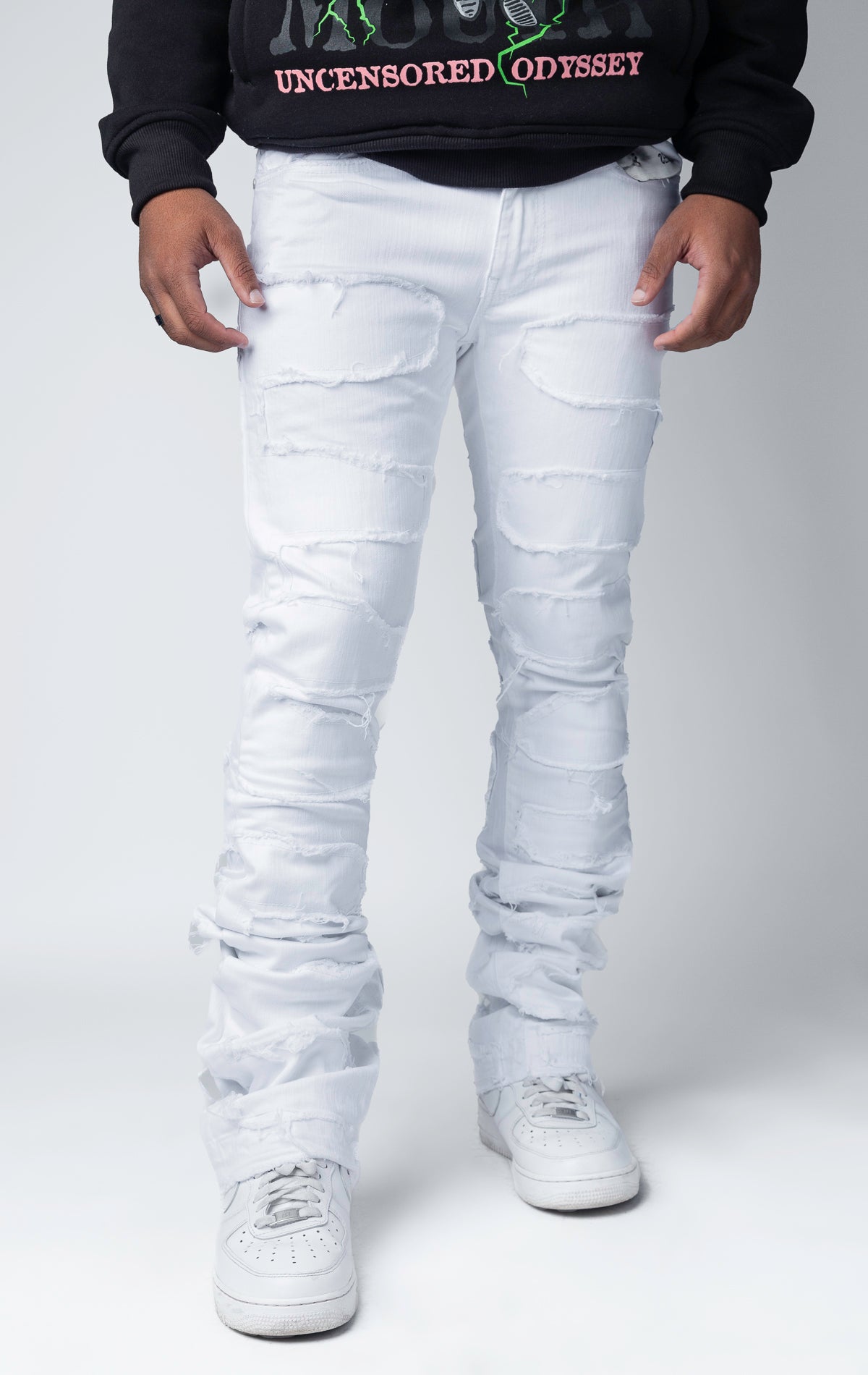 - Patches and abrasions throughout enhance the distressed aesthetic