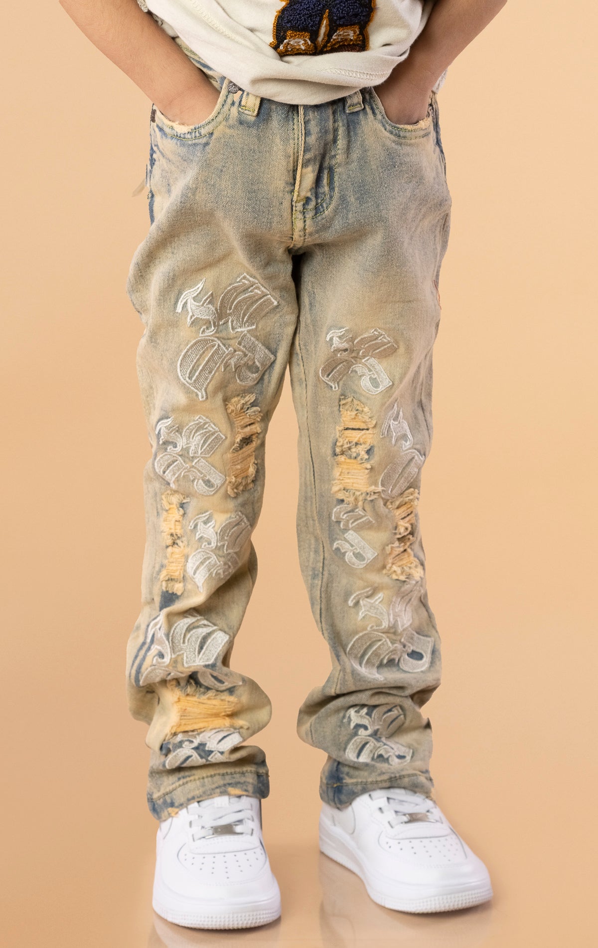 Let your little one stand out in style with the Kids Embroidered Stacked Jeans. Crafted from high-quality denim, these jeans feature bold, all-over embroidered graphics that add a unique, eye-catching touch. The distressed detailing brings a cool, edgy vibe, while the stacked fit creates a modern silhouette perfect for trendy kids. Designed for both comfort and style, these jeans are a must-have for any fashion-forward wardrobe.