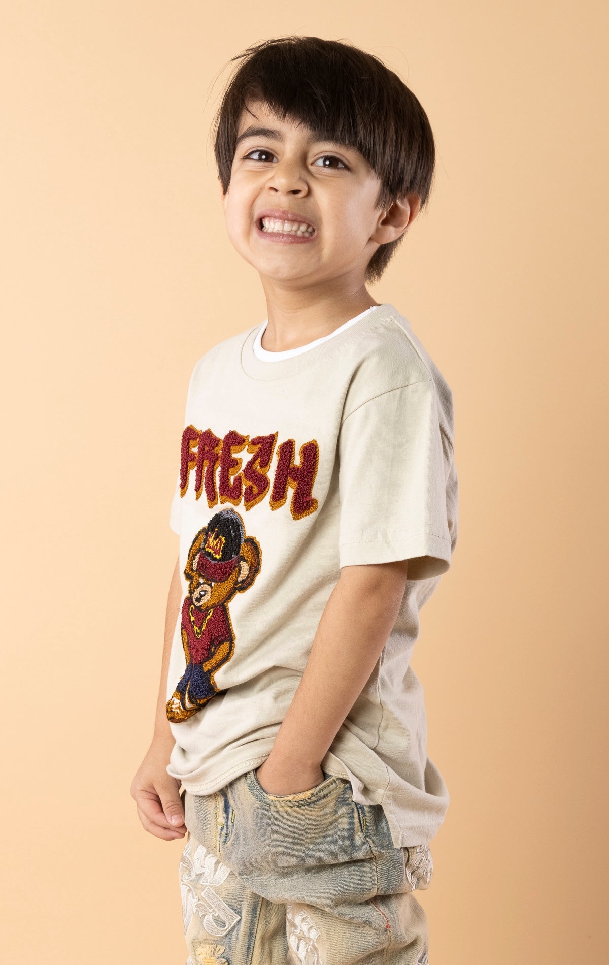 Soft, stylish, and full of character—this Kids  Crew Neck T-Shirt is designed for comfort and standout style. Featuring a bold embroidered graphic on the front, this tee showcases chenille embroidery, known for its soft, fuzzy, and raised texture, giving it a plush, varsity-style look. Crafted from high-quality fabric, this short-sleeve t-shirt is perfect for everyday wear while adding a touch of retro streetwear flair to your little one's wardrobe.