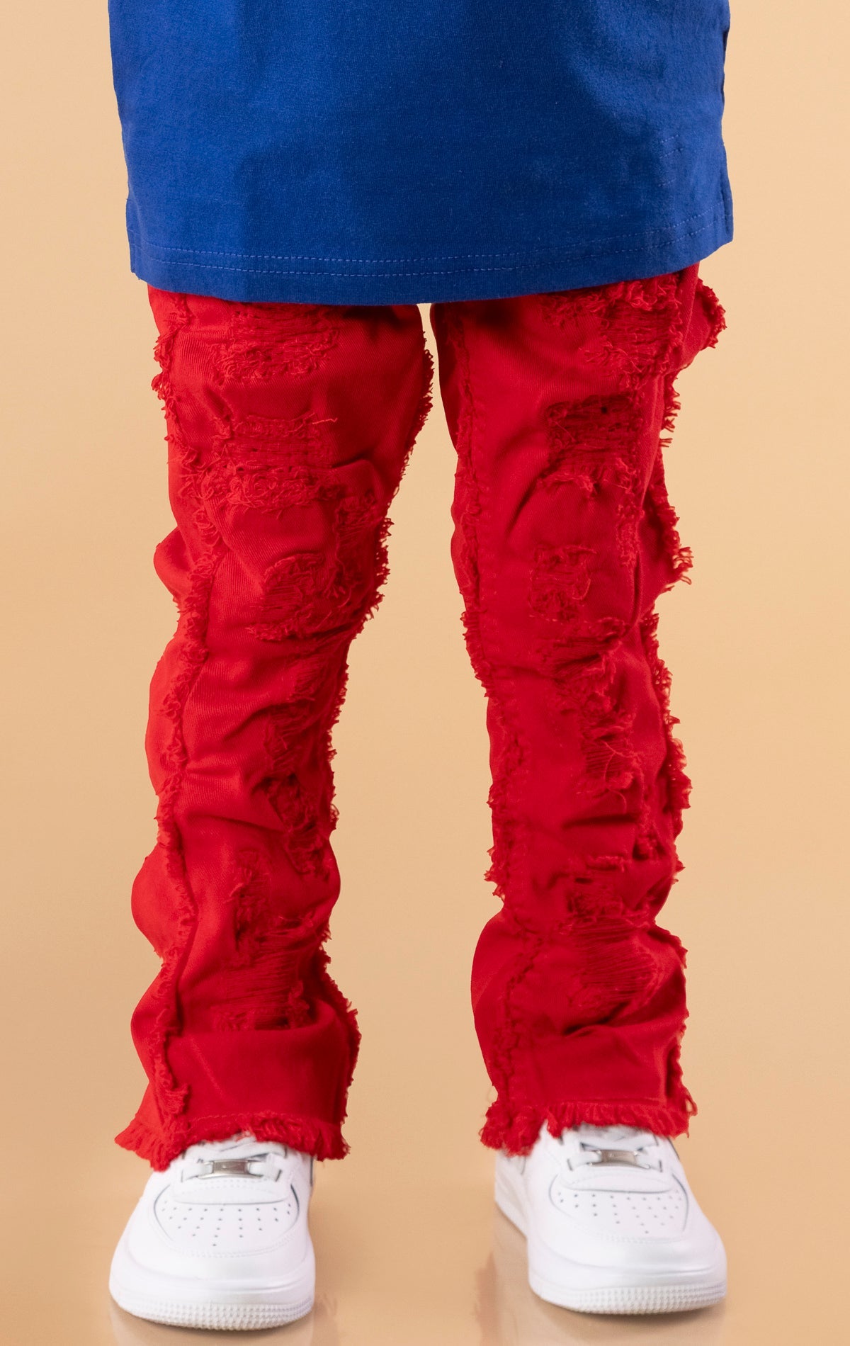 Designed for a modern streetwear vibe, these Kids Stacked Jeans feature an extra-long inseam that naturally gathers around the ankles to create a bold, layered effect. The stacked silhouette gives your child an on-trend look while still allowing room for movement and comfort. Available in Olive, Red, and Black, these jeans are perfect for adding personality and edge to any casual outfit.