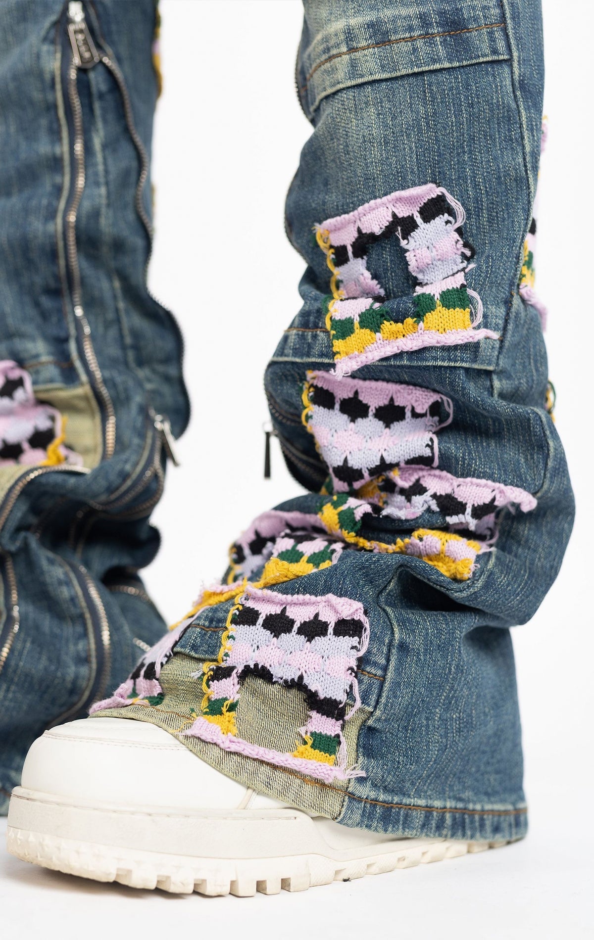 Elevate your denim game with our Knit Patches Stacked Denim. This innovative design combines the comfort of a knit fabric with the style of stacked denim. The adjustable zippers at the ankle allow you to customize the fit, while the eye-catching knit patches and custom hardware add a touch of personality.