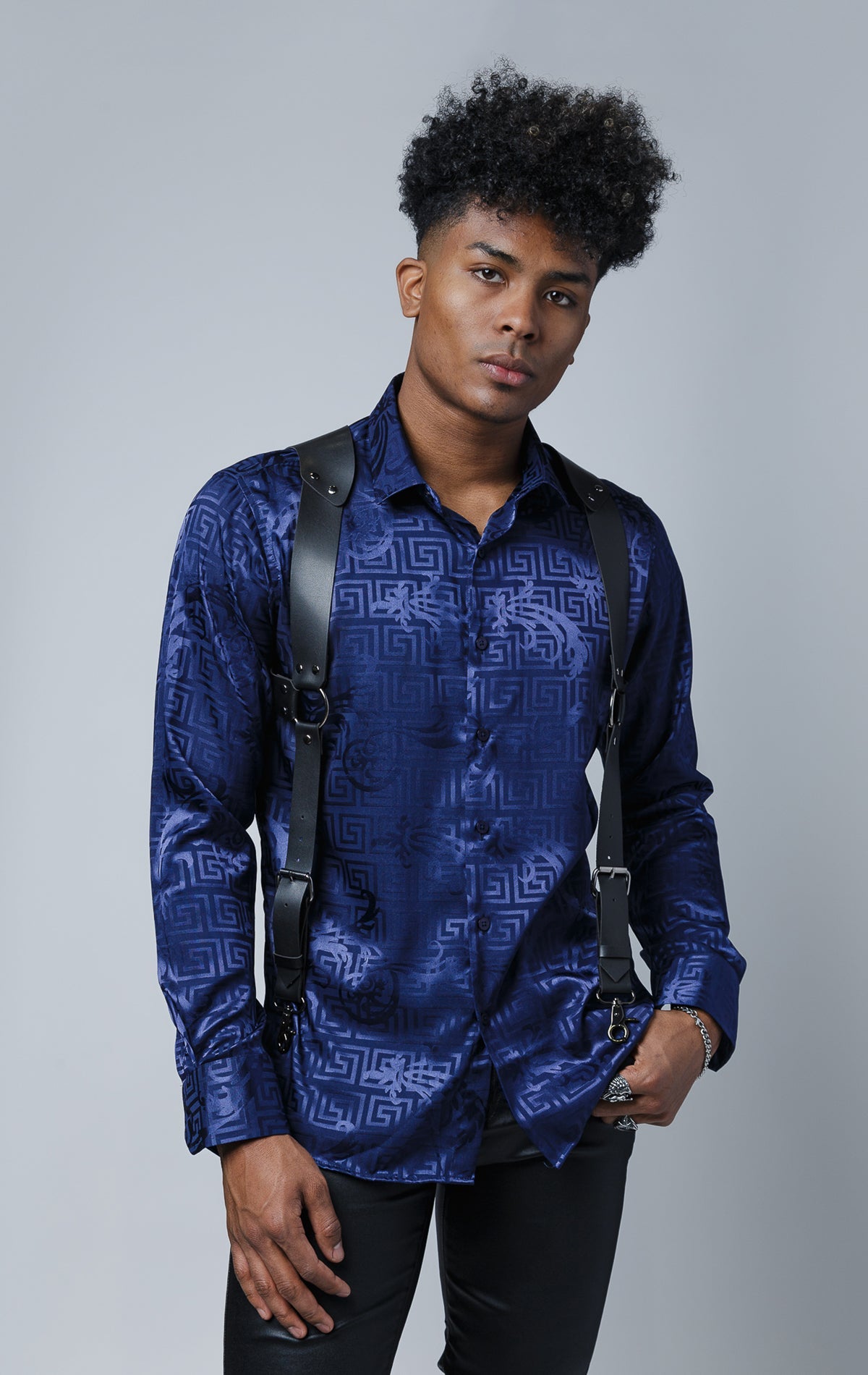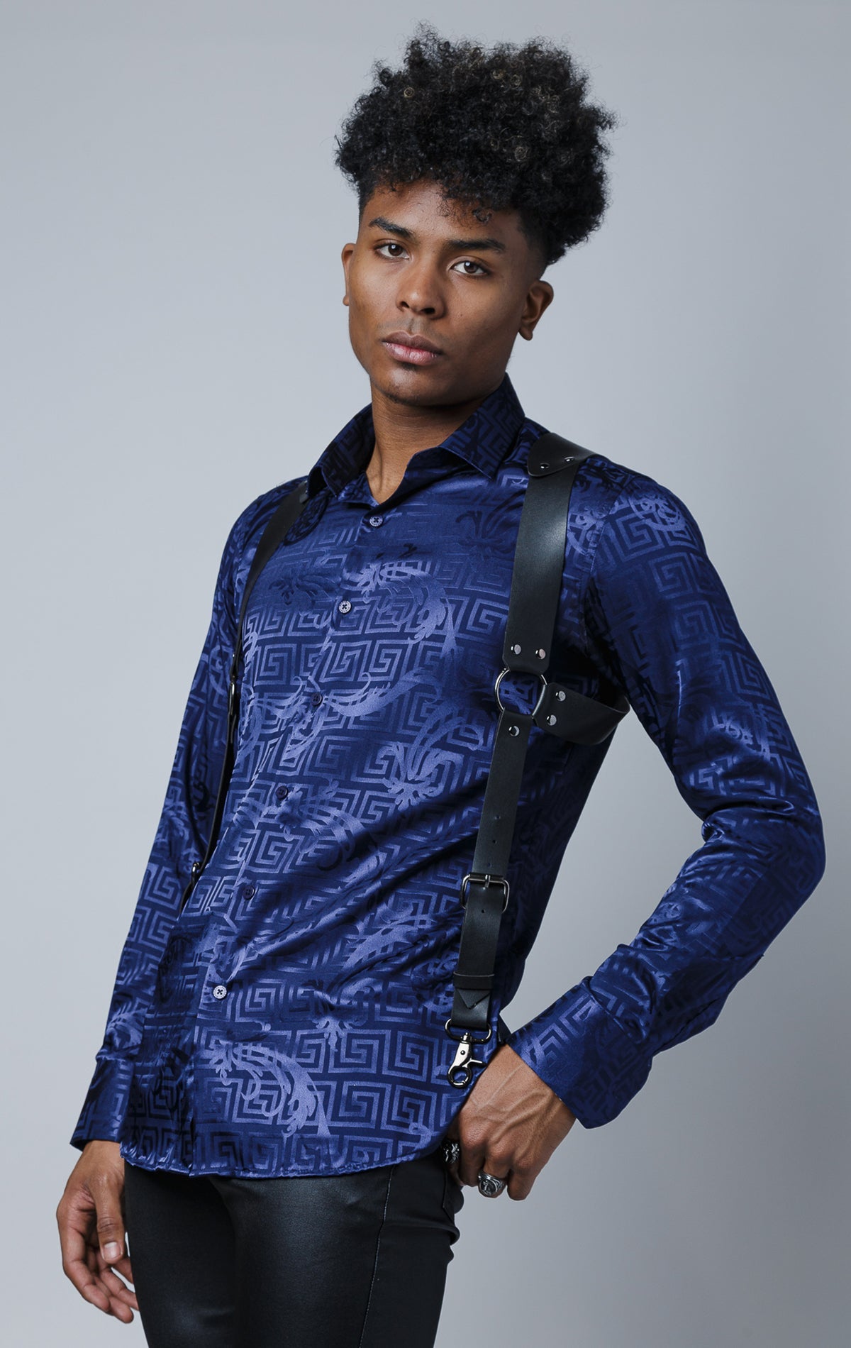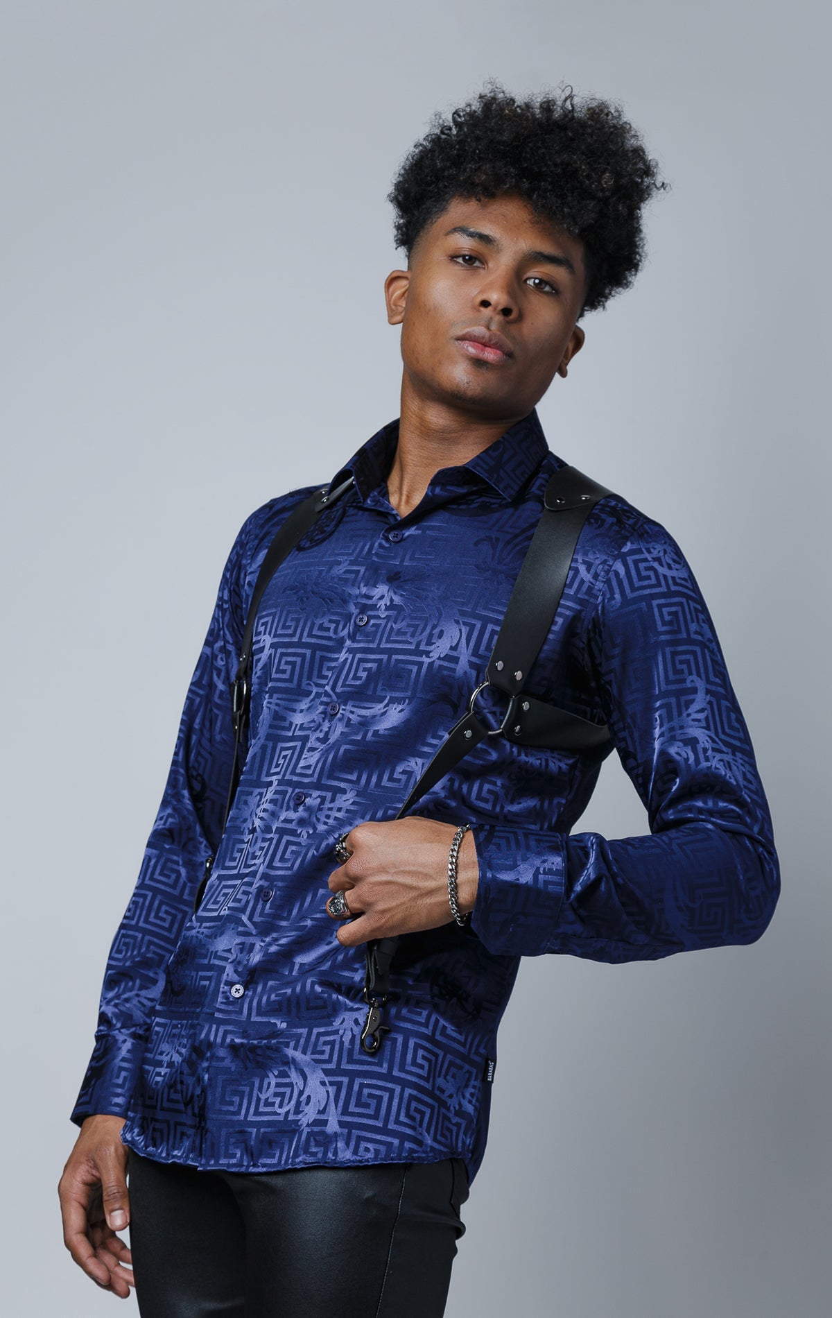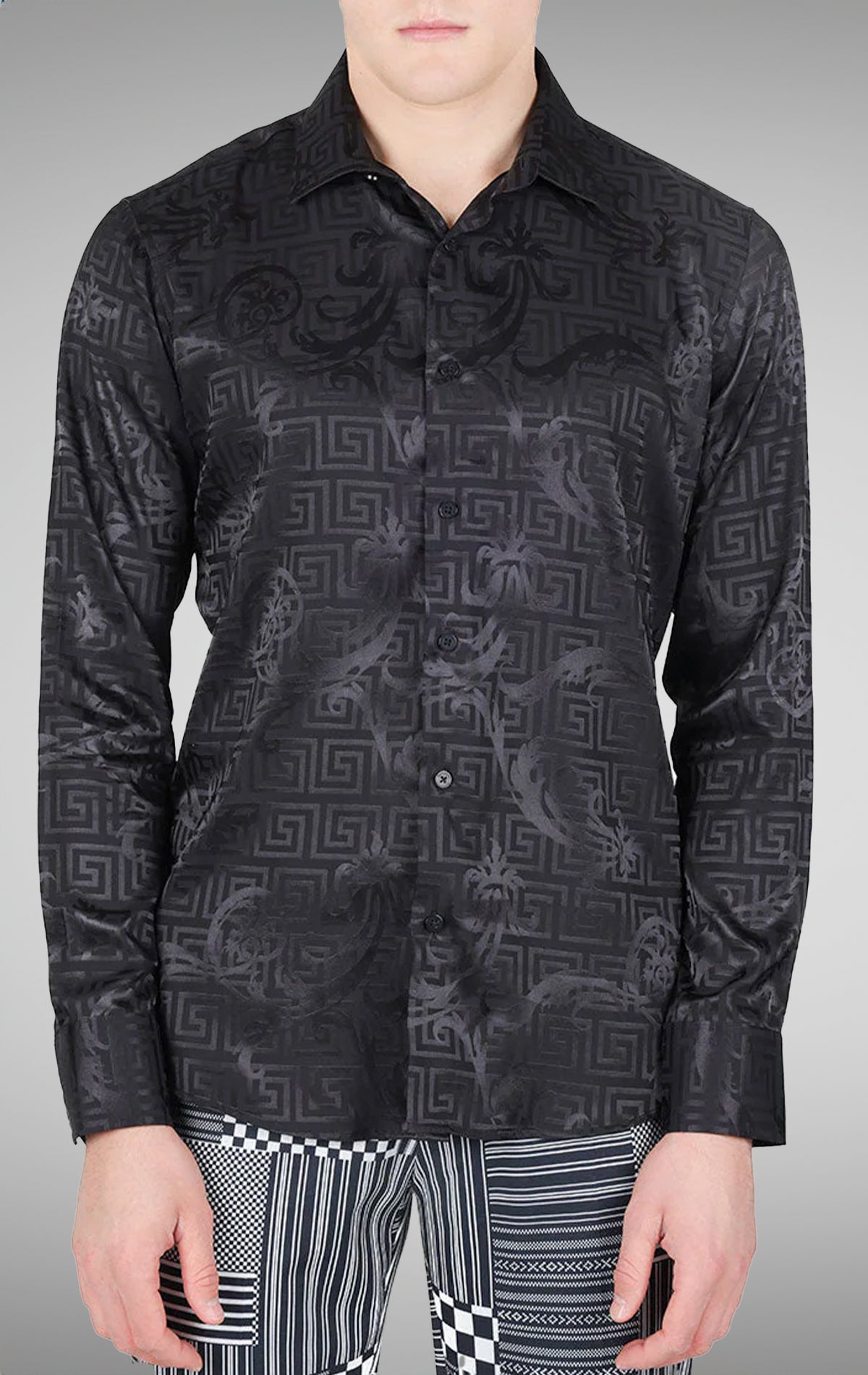 This new men's Greek key, maze, labyrinth, or meander pattern design long sleeve metallic shirt is a hot topic this season as these designs are inspired by summer vibes. This new luxury design of long-sleeve button-down shirts are not for the introverts but rather for those who want to break the rules! Go bold, vibrant, eye-catching, and set the trend this summer season.