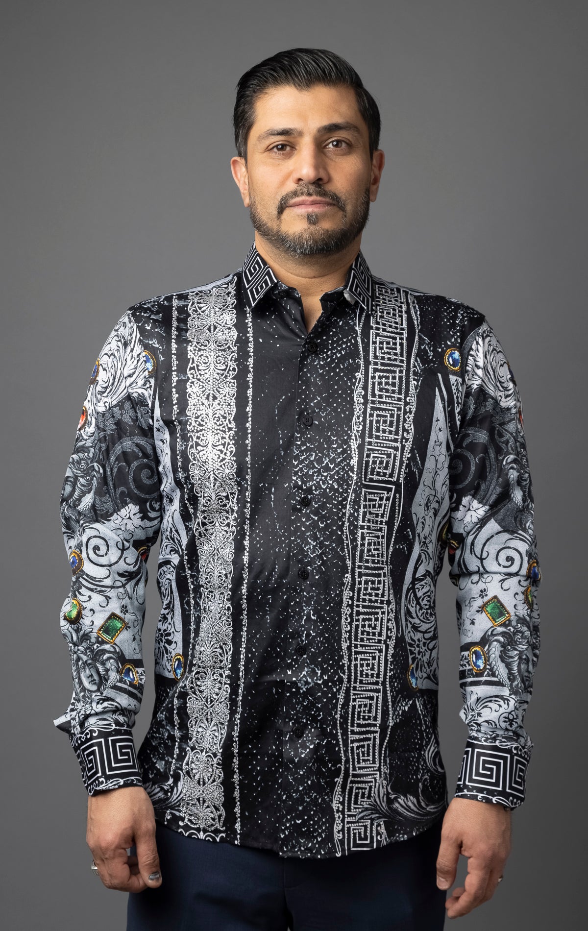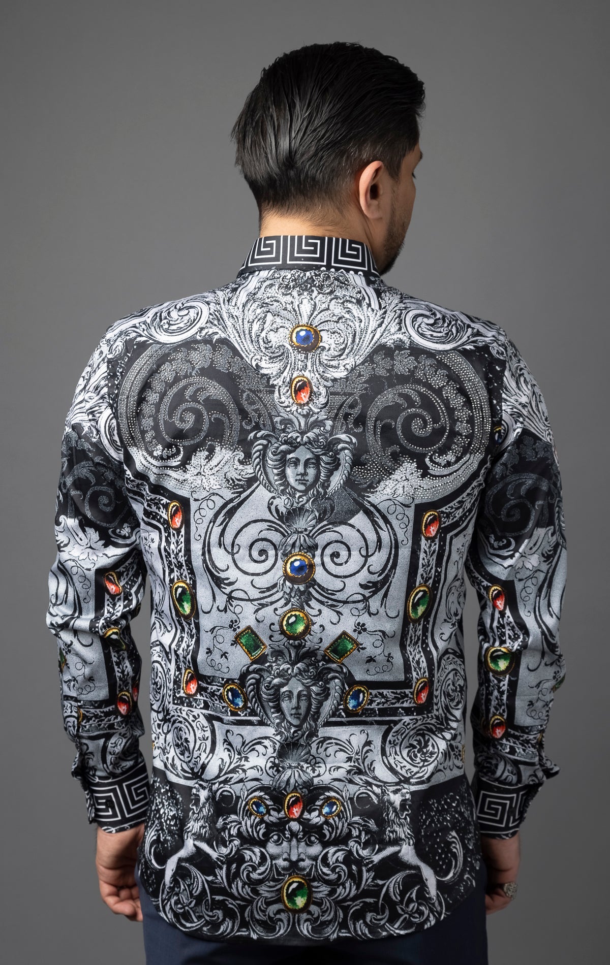 Introducing the "Summer Night Stone" button-up shirt collection from "Under the Sun". This eye-catching selection features bold floral, Greek key pattern, rhinestone, Medusa, and jewels prints, making sure you stand out this summer. Designed with lightweight, long-sleeve construction and hand-placed rhinestones, this shirt offers both style and comfort. Crafted from 100% cotton satin stretch, it requires dry cleaning to maintain its premium quality. Make a bold statement and break the rules with the latest from "Under the Sun".