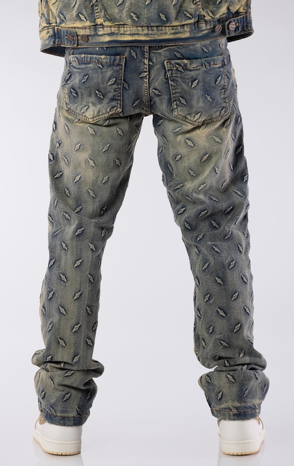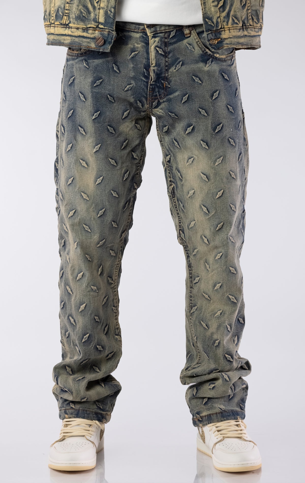 These jeans bring raw texture and attitude to everyday denim. Featuring a diamond plate pattern embossed directly into the fabric, they deliver an industrial edge with a premium finish. The relaxed fit and distressed light tint wash create a laid-back vibe, while the all-over embossed design adds a bold, consistent structure throughout.