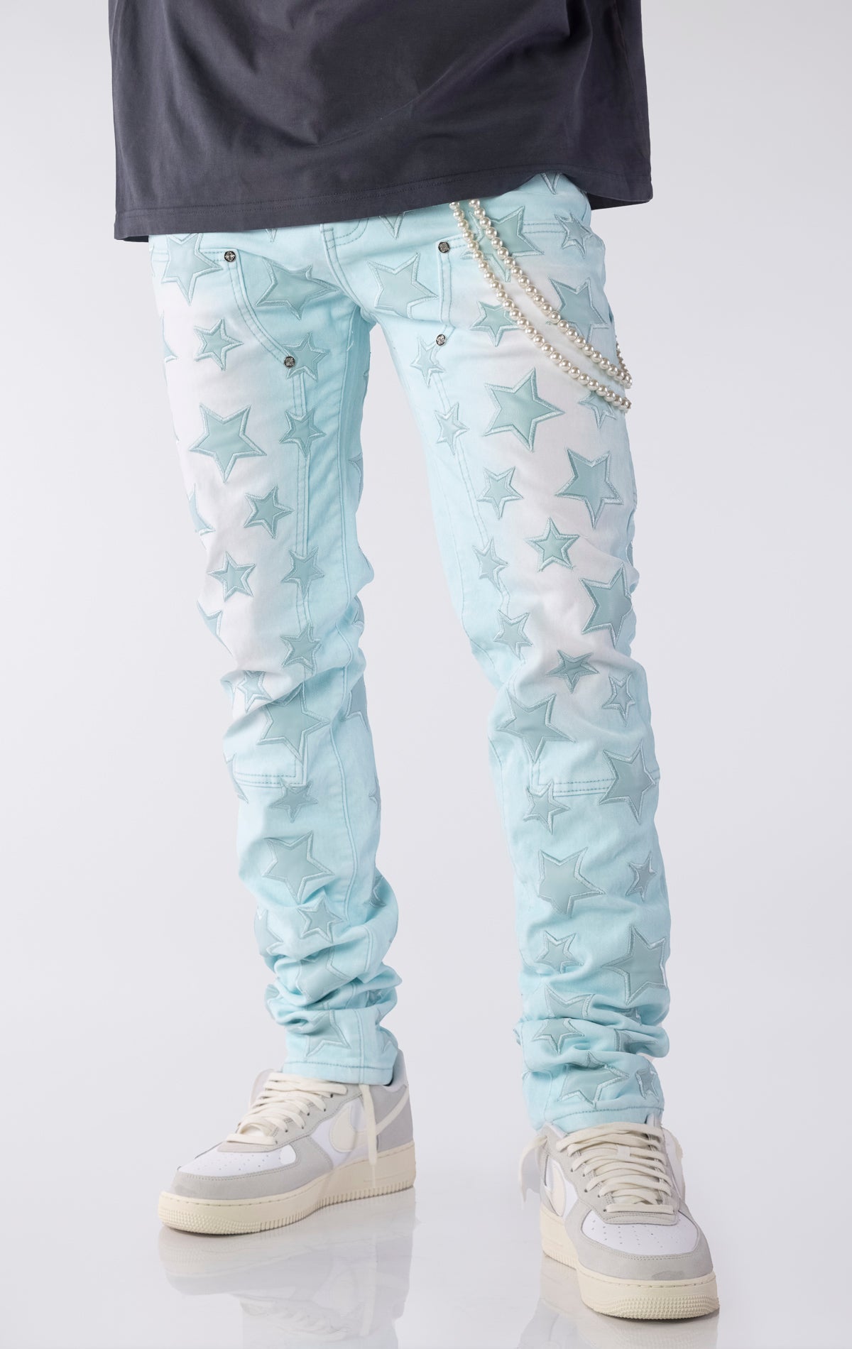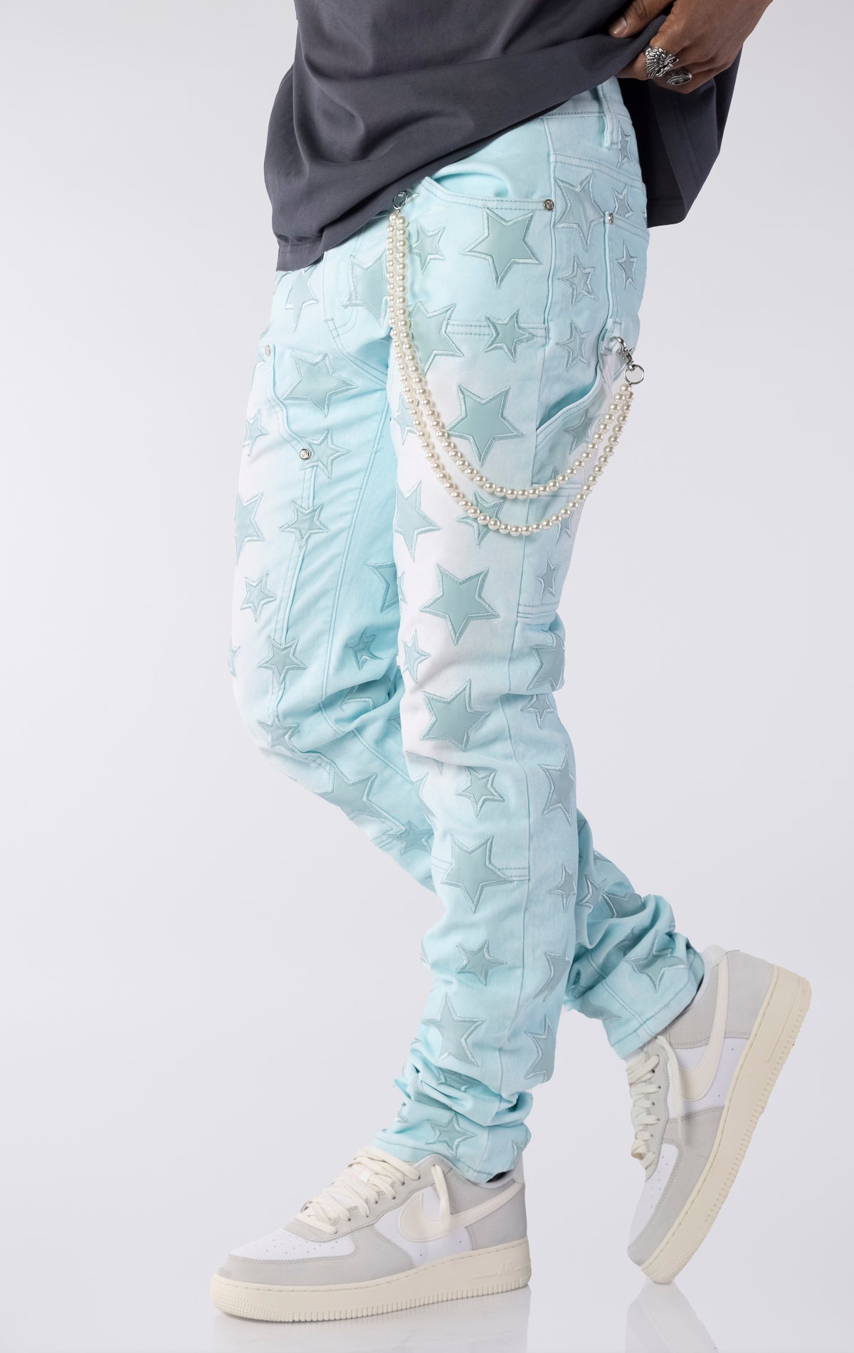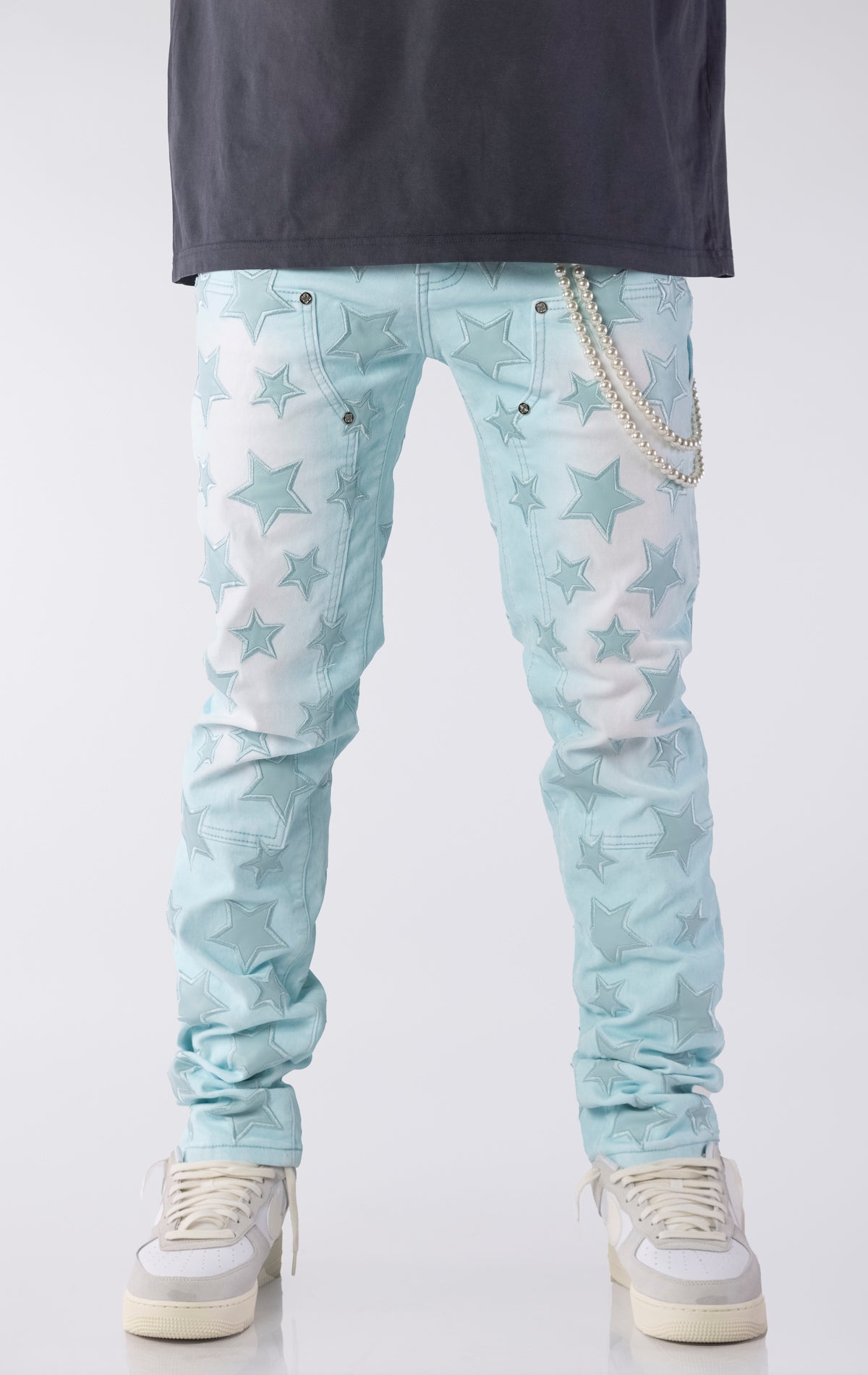 The Vintage Stars Denim brings bold energy and artistic edge to your wardrobe. Featuring all-over star embroidery on a lightly vintage-washed fabric, this pair balances creative flair with classic denim construction. The slim, stacked fit is designed to fall perfectly over your footwear, while subtle metal accents add just the right amount of attitude.