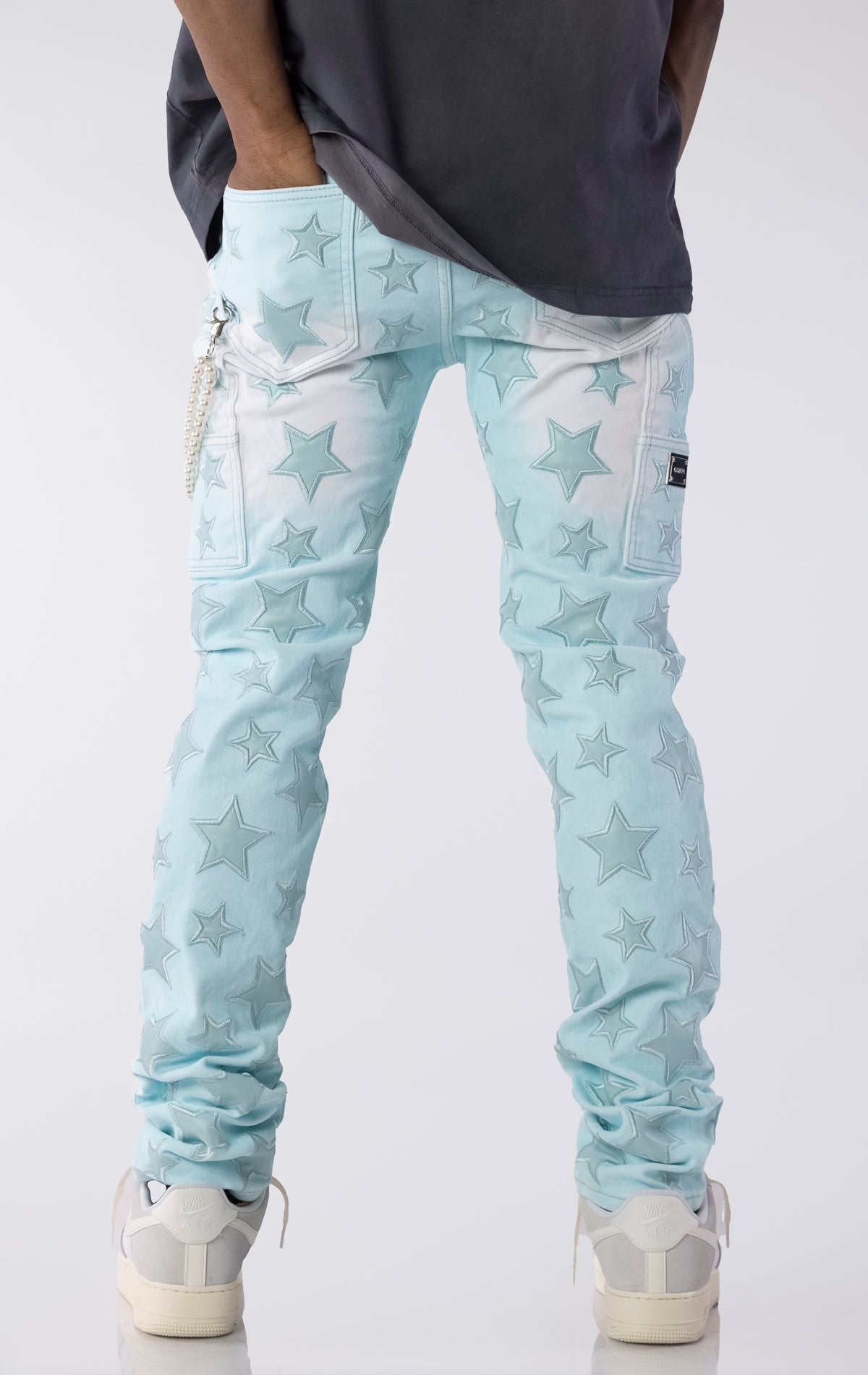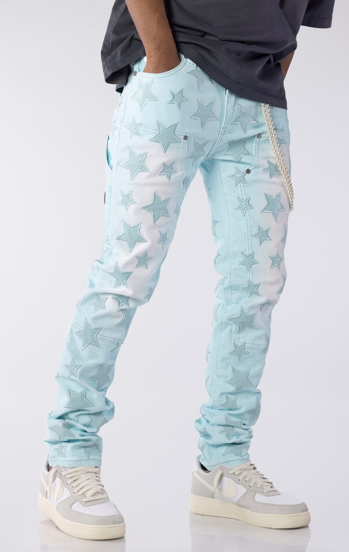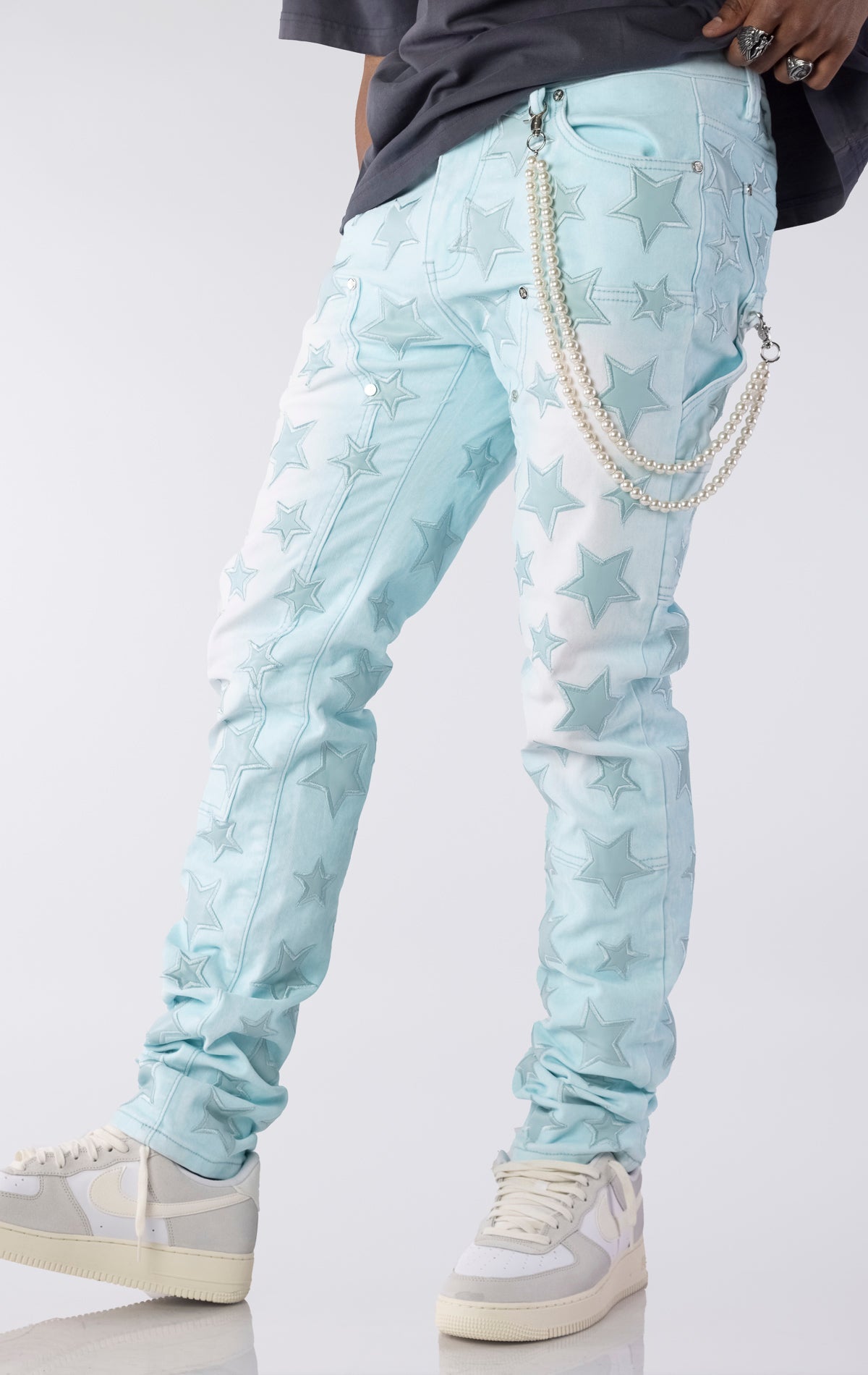 The Vintage Stars Denim brings bold energy and artistic edge to your wardrobe. Featuring all-over star embroidery on a lightly vintage-washed fabric, this pair balances creative flair with classic denim construction. The slim, stacked fit is designed to fall perfectly over your footwear, while subtle metal accents add just the right amount of attitude.