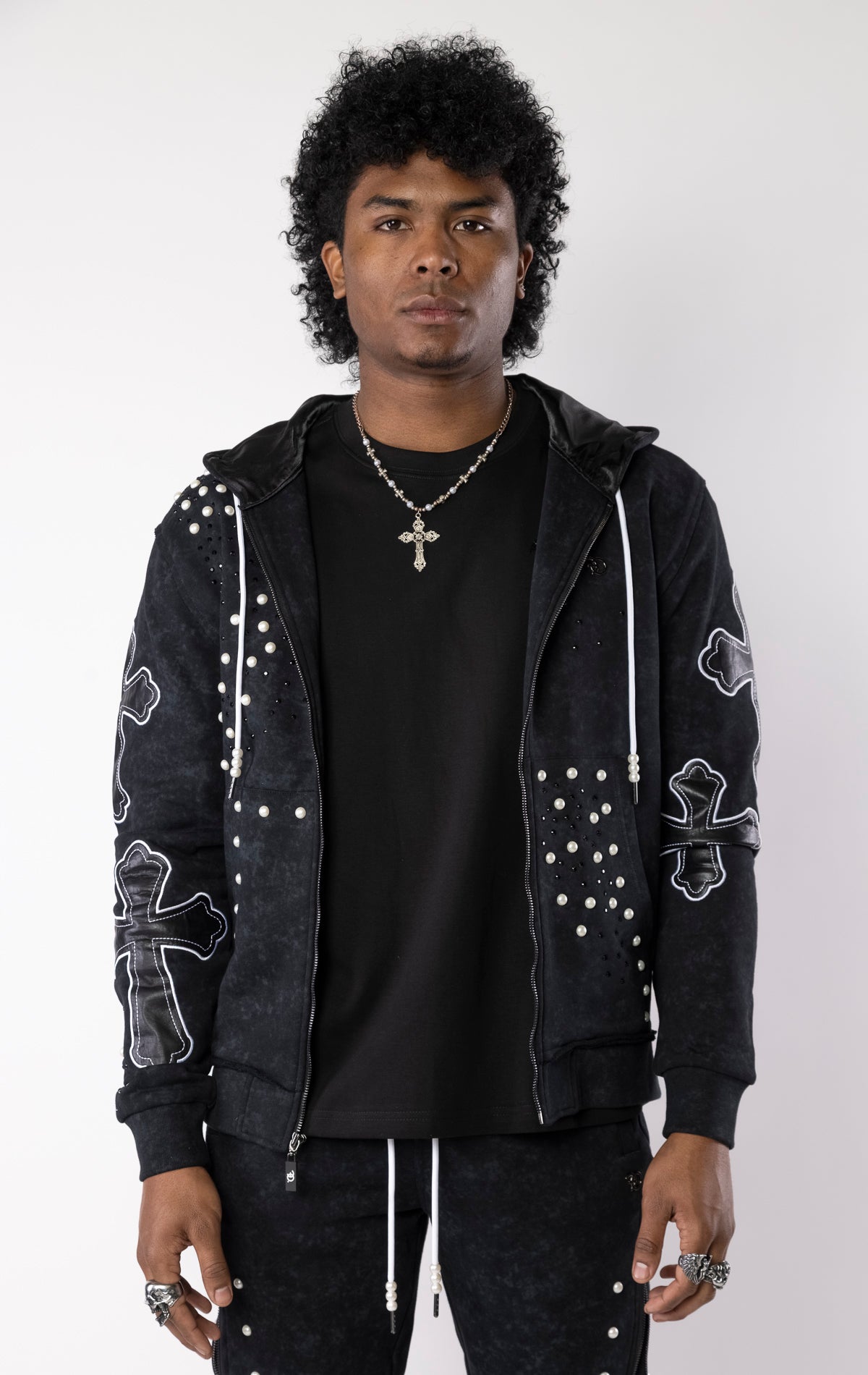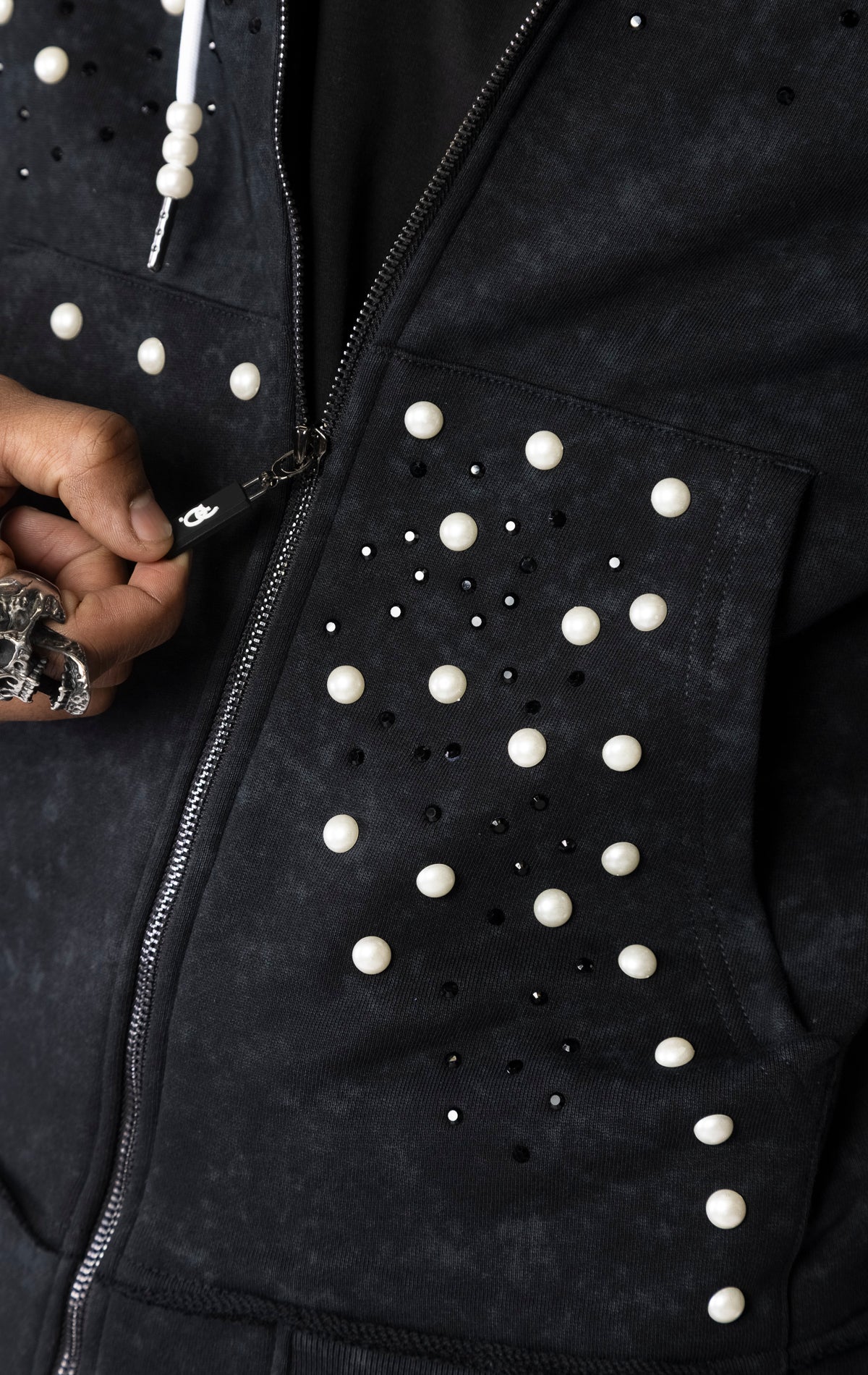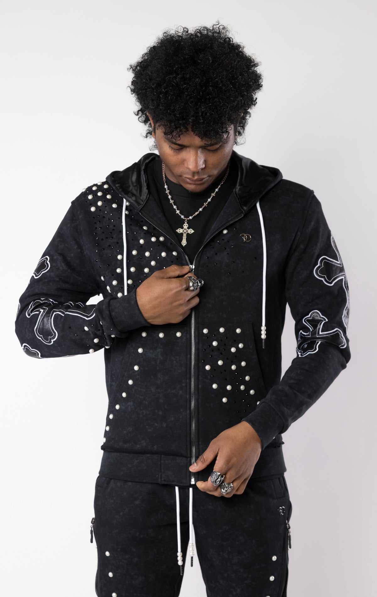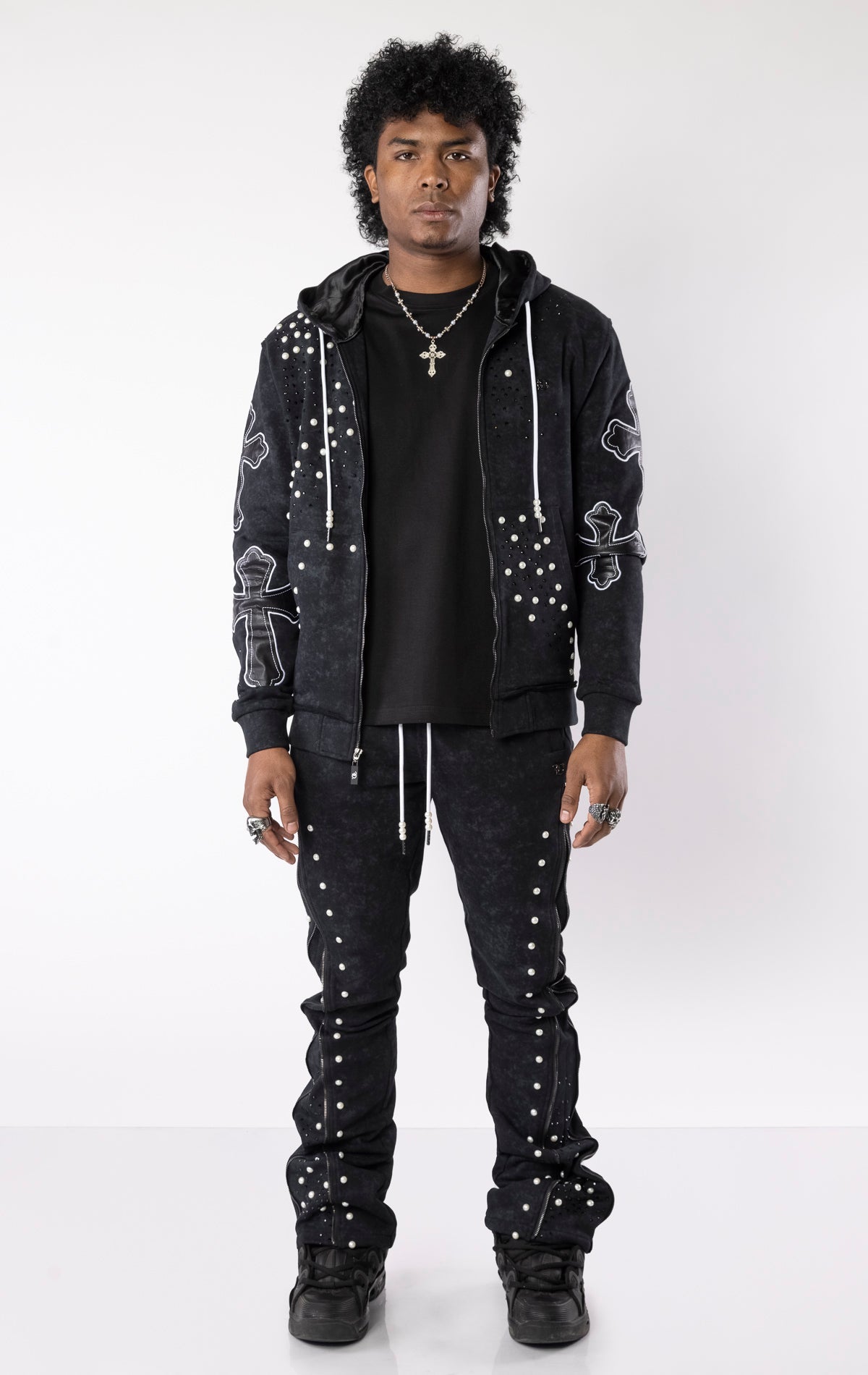 Elevate your streetwear collection with the Loyalty Hoodie Set, a fusion of luxury and urban fashion. Crafted from premium French terry fabric, this set offers unmatched comfort with an effortlessly stylish edge. Designed with rhinestones, heated pearls, and PU appliqué detailing, it embodies timeless streetwear with a bold statement. The zip-up hoodie features a satin-lined hood, an open raw seam, and pearl-tipped drawstrings, while the matching pants come with an extra-long inseam and contrast drawcord for a refined finish. This set is a must-have for those who appreciate high-end, fashion-forward street style.