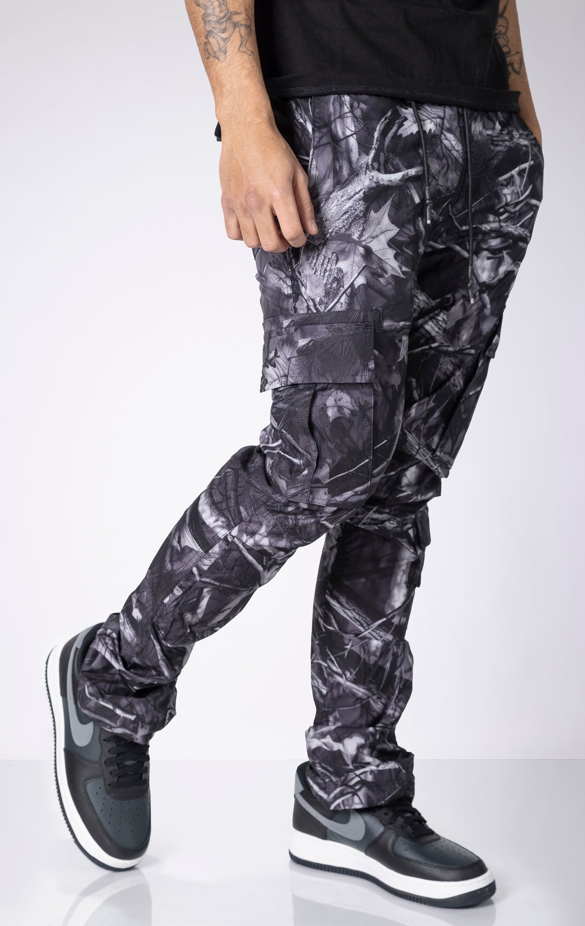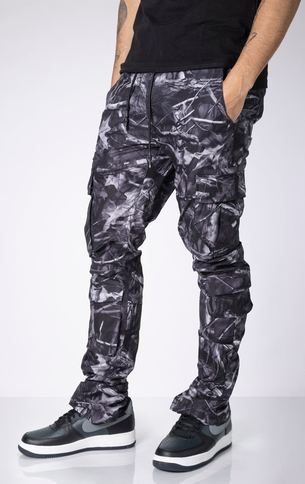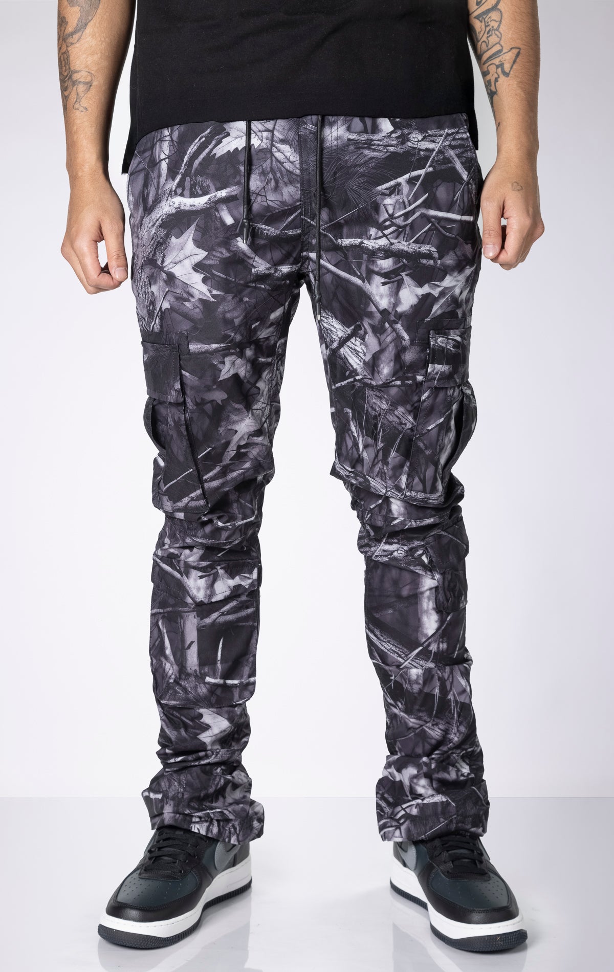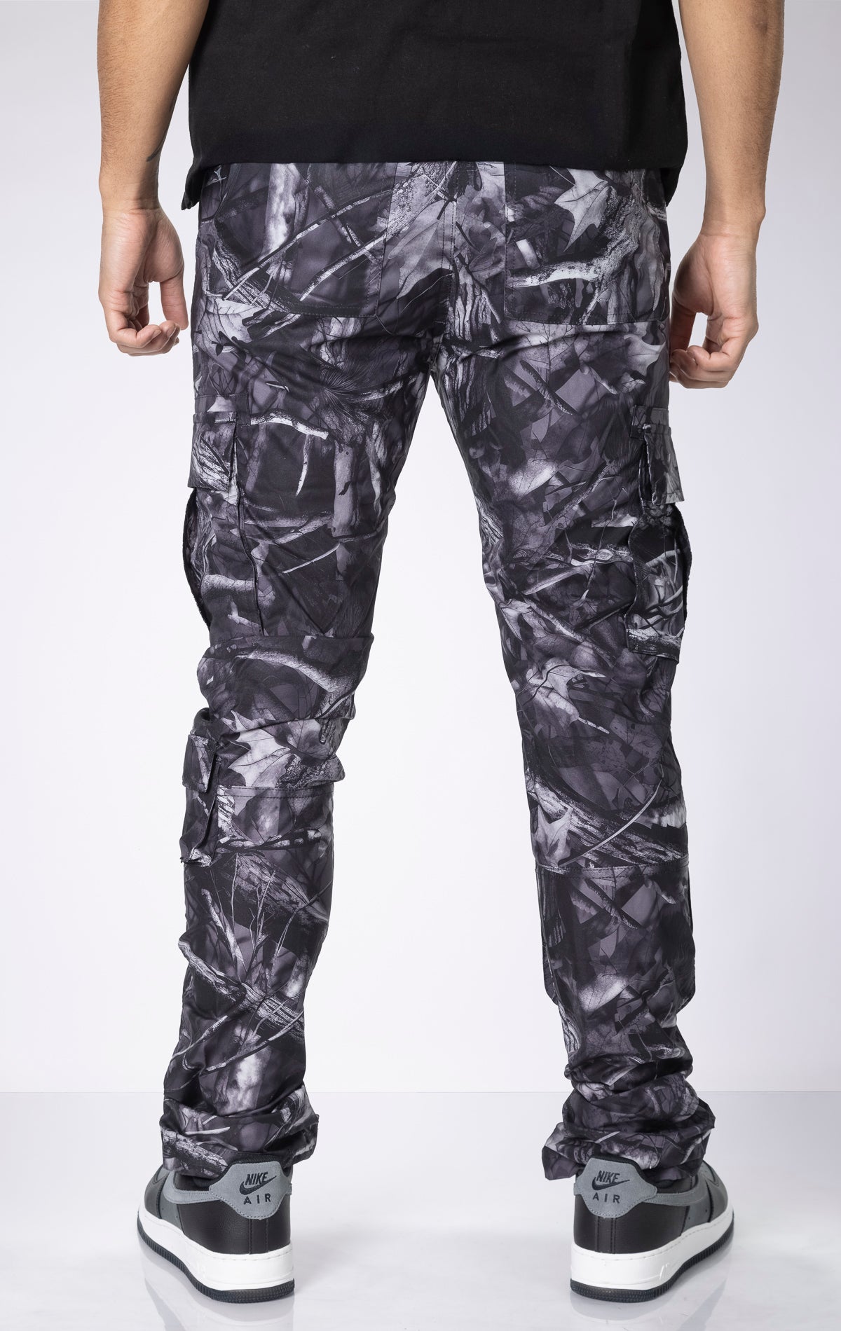 Experience ultimate comfort and style with our Camo Stacked Cargo Pants. Designed for maximum impact, these pants feature an extended length inseam for impressive stacks, a flared leg opening, and an allover camo print for a bold and edgy look.