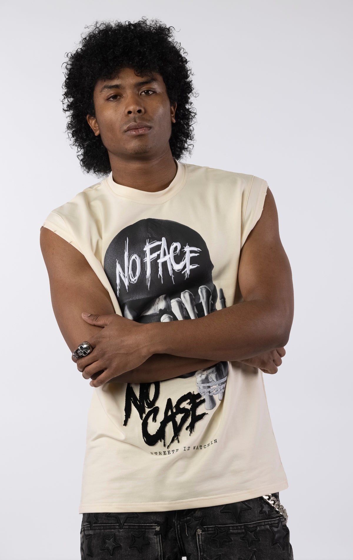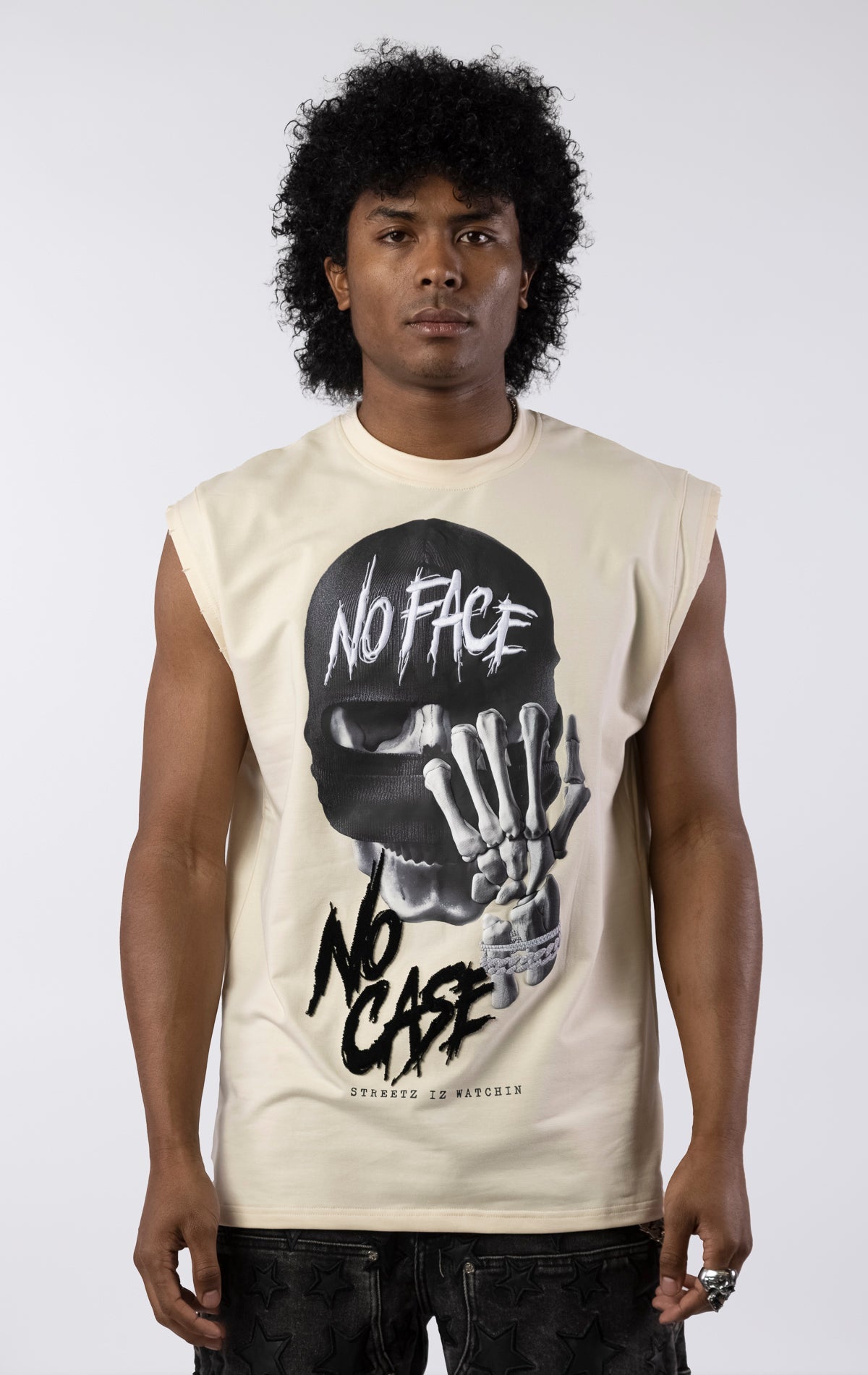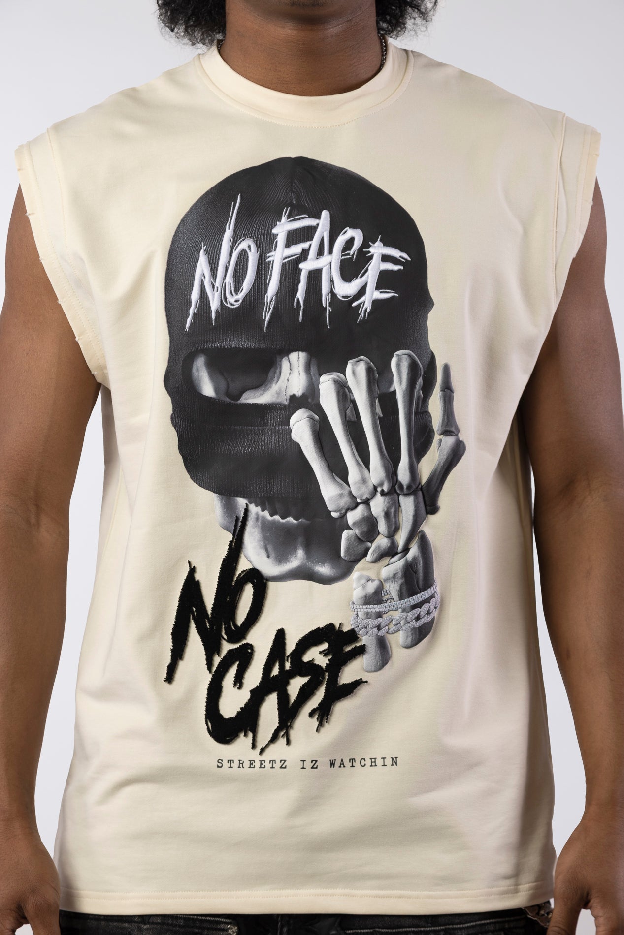 Embrace the edgy, anonymous style of the street with the "No Face No Case" Cutoff T-Shirt. This shirt features a powerful graphic of a skeleton wearing a balaclava, with a diamond-studded bracelet gripping the skull. The bold text "NO FACE NO CASE" is split across the design, making an undeniable statement. Available in two distinct colorways, this shirt offers a relaxed, comfortable cutoff design for an instantly cool aesthetic.