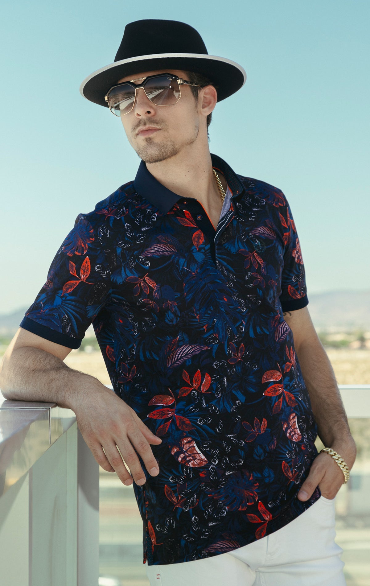 Men's casual dress polo shirt. Distinguish yourself with contrasting patterns and sophisticated details. Comfortable with high-end cotton fabric. Offers confidence and freedom of movement.