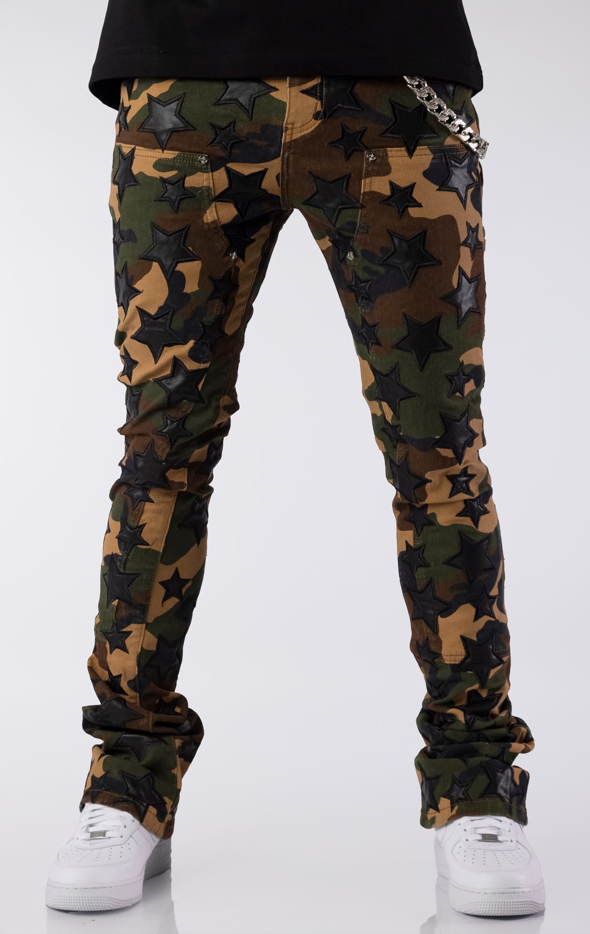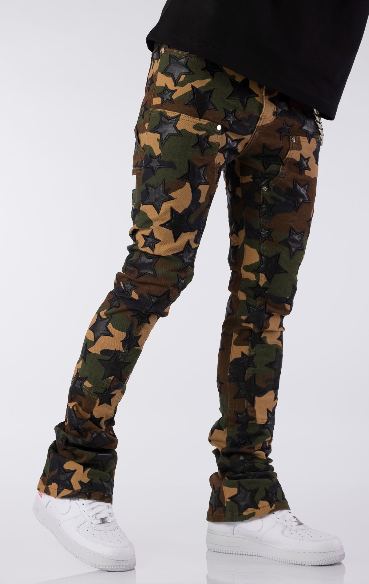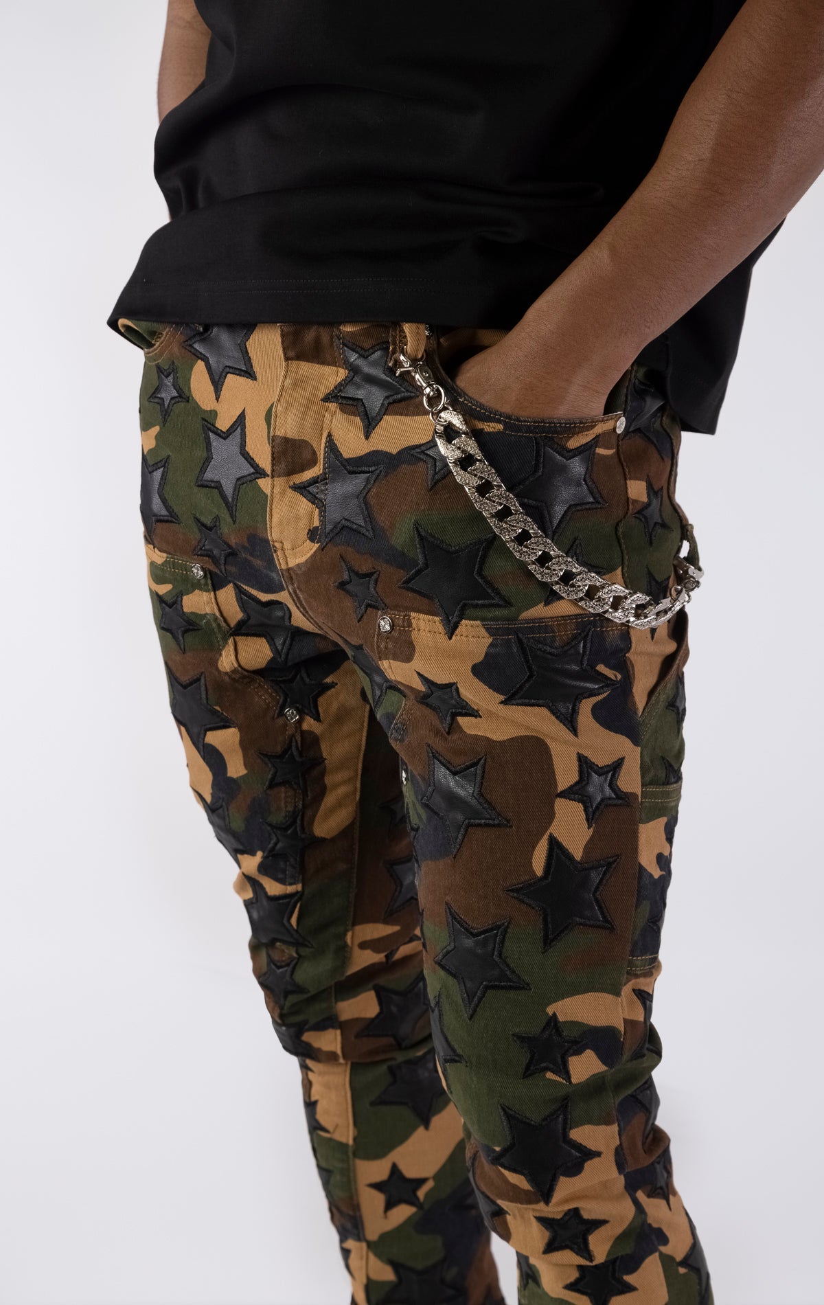 Make a bold fashion statement with these Camo Pockets Flared Denim. This pair fuses military-inspired details with a flattering, retro-inspired silhouette, perfect for those looking to stand out in both style and comfort. Featuring a stylish wide-leg flare, these jeans elongate the legs while adding a vintage vibe. The camouflage fabric on the front and back pockets gives an edgy, tactical twist, making these jeans as functional as they are fashionable.
