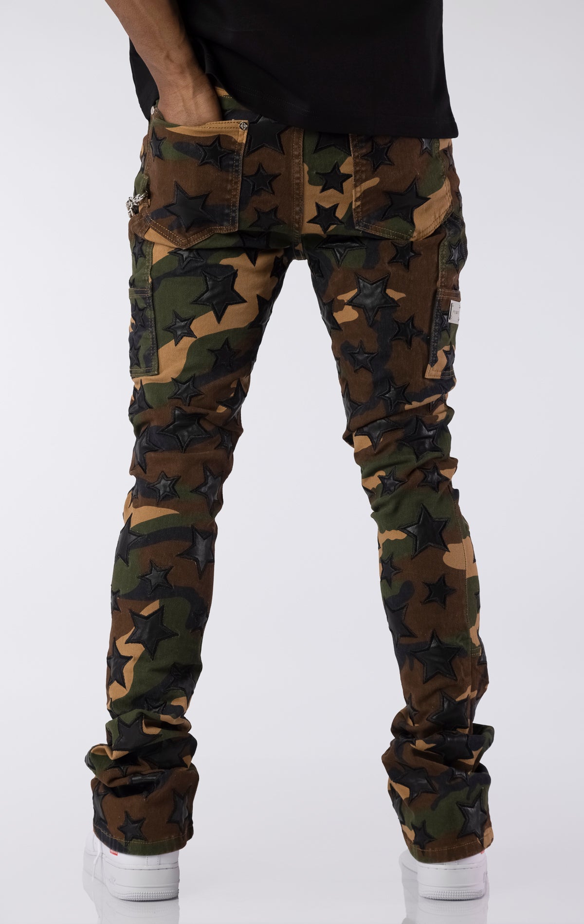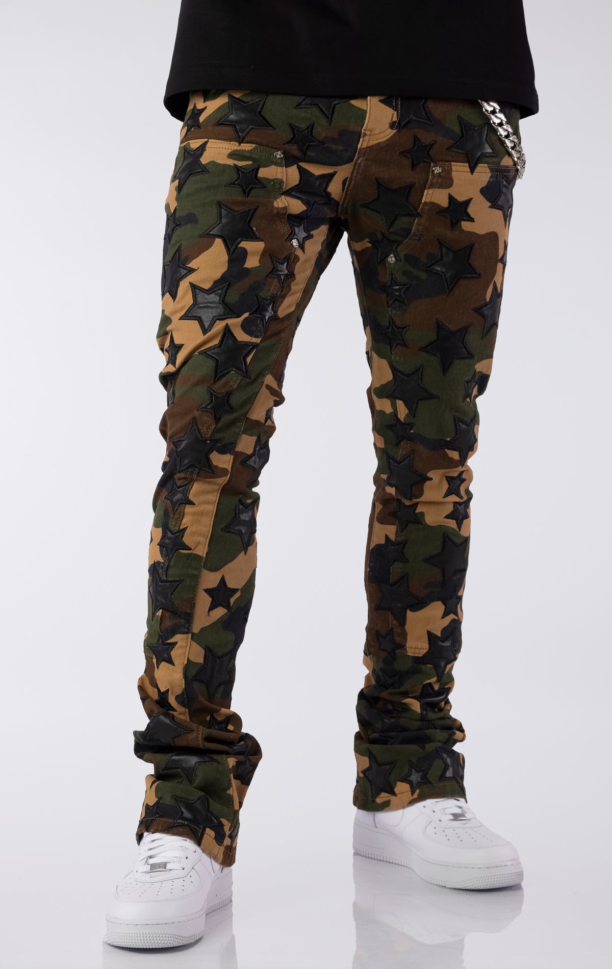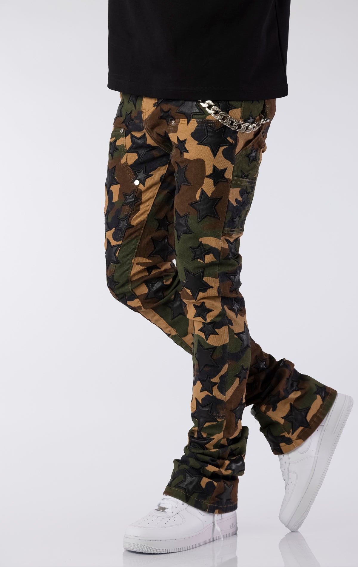 Make a bold fashion statement with these Camo Pockets Flared Denim. This pair fuses military-inspired details with a flattering, retro-inspired silhouette, perfect for those looking to stand out in both style and comfort. Featuring a stylish wide-leg flare, these jeans elongate the legs while adding a vintage vibe. The camouflage fabric on the front and back pockets gives an edgy, tactical twist, making these jeans as functional as they are fashionable.