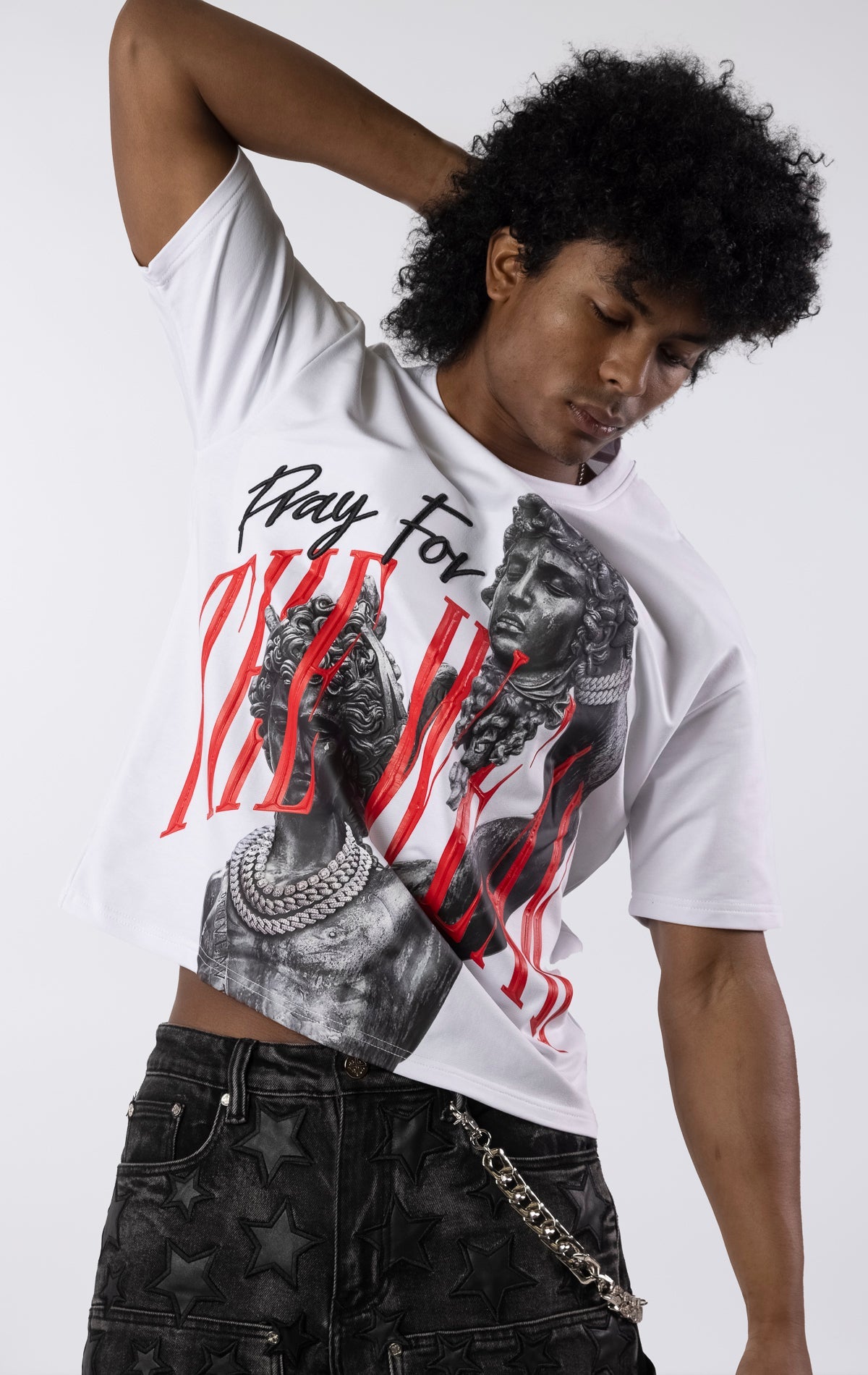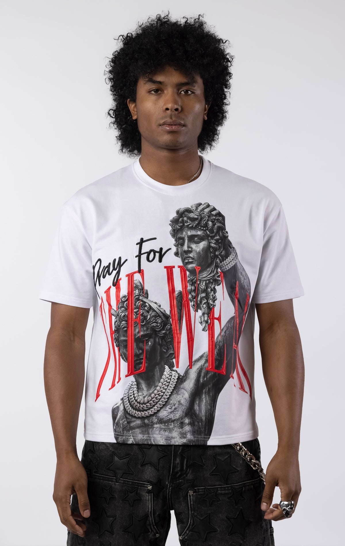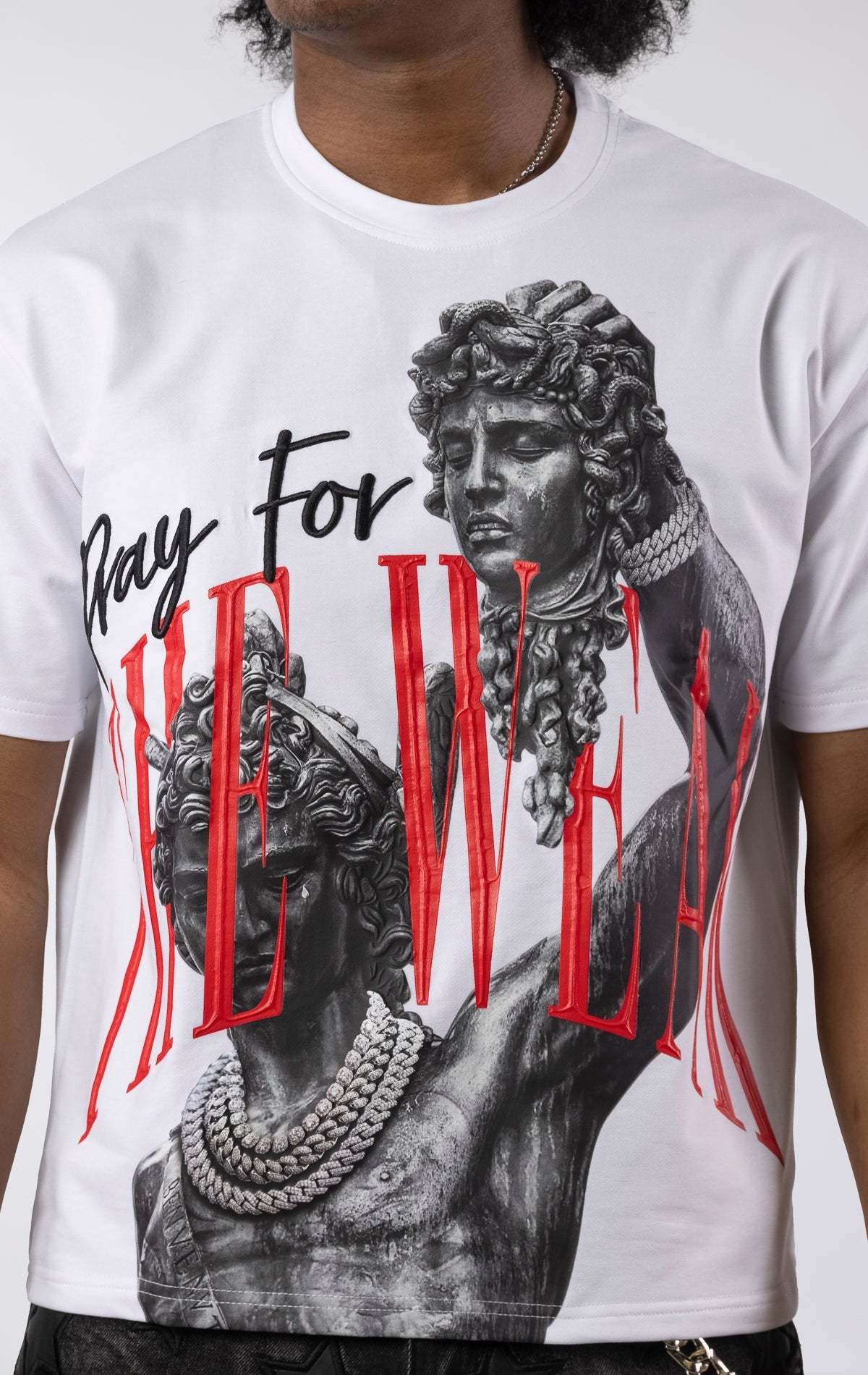 The Pray For The Weak 2 T-Shirt in white features an intense front graphic with classical sculpture-inspired imagery and bold red lettering. “PRAY FOR THE WEAK” is layered dramatically over two black-and-white statues, giving the piece a high-contrast, streetwear-meets-art aesthetic. The back is clean and minimal for balance. Constructed from soft, breathable cotton, this short-sleeve tee offers a standard fit with a comfortable crew neckline.
