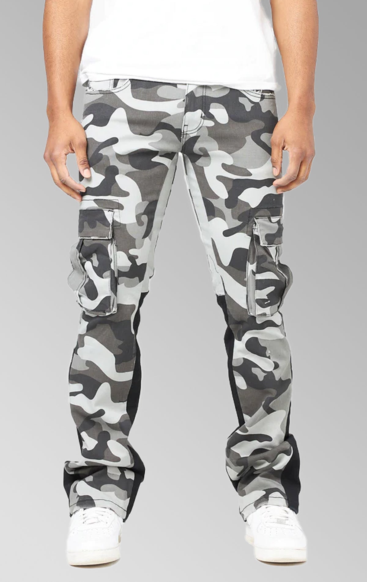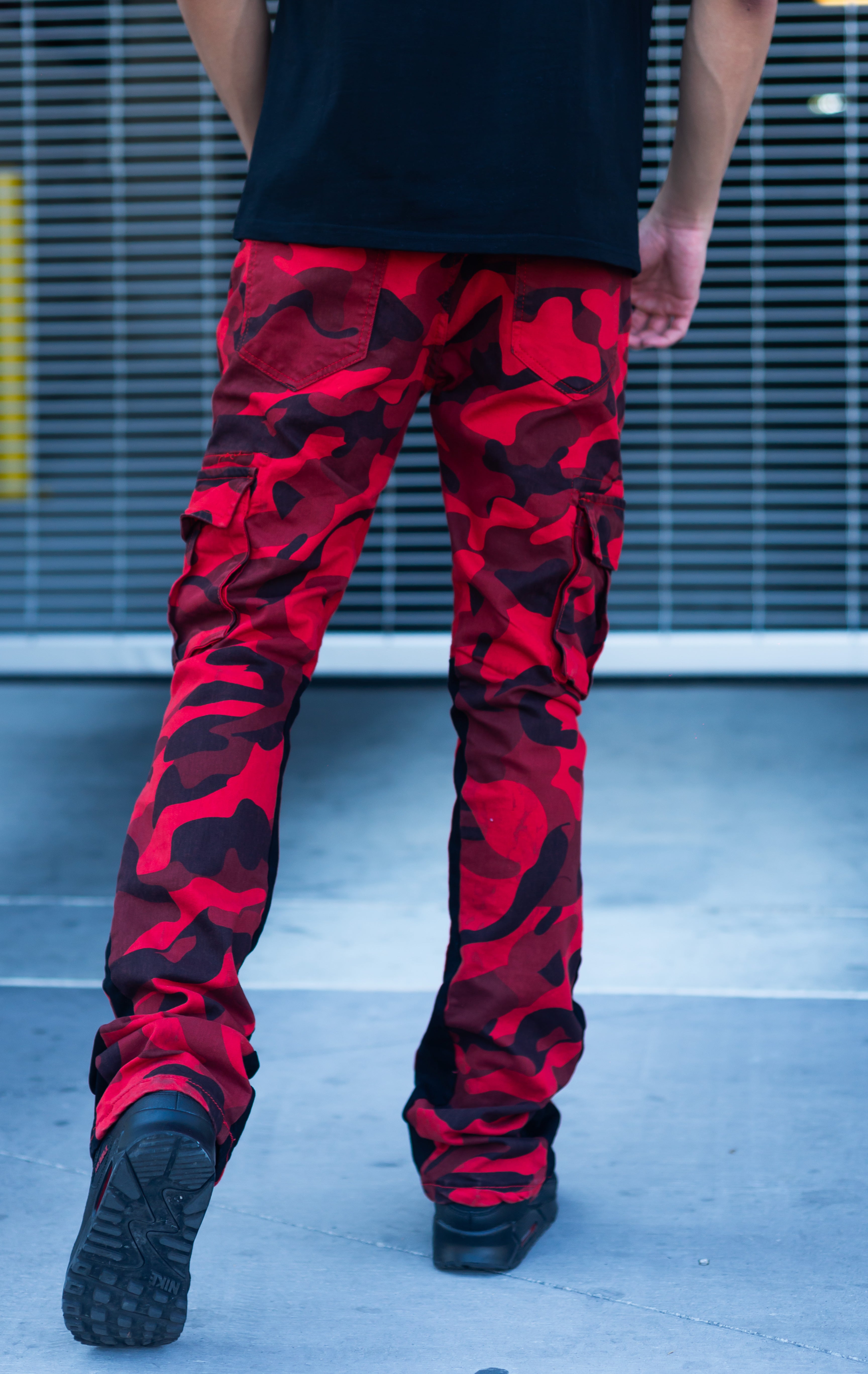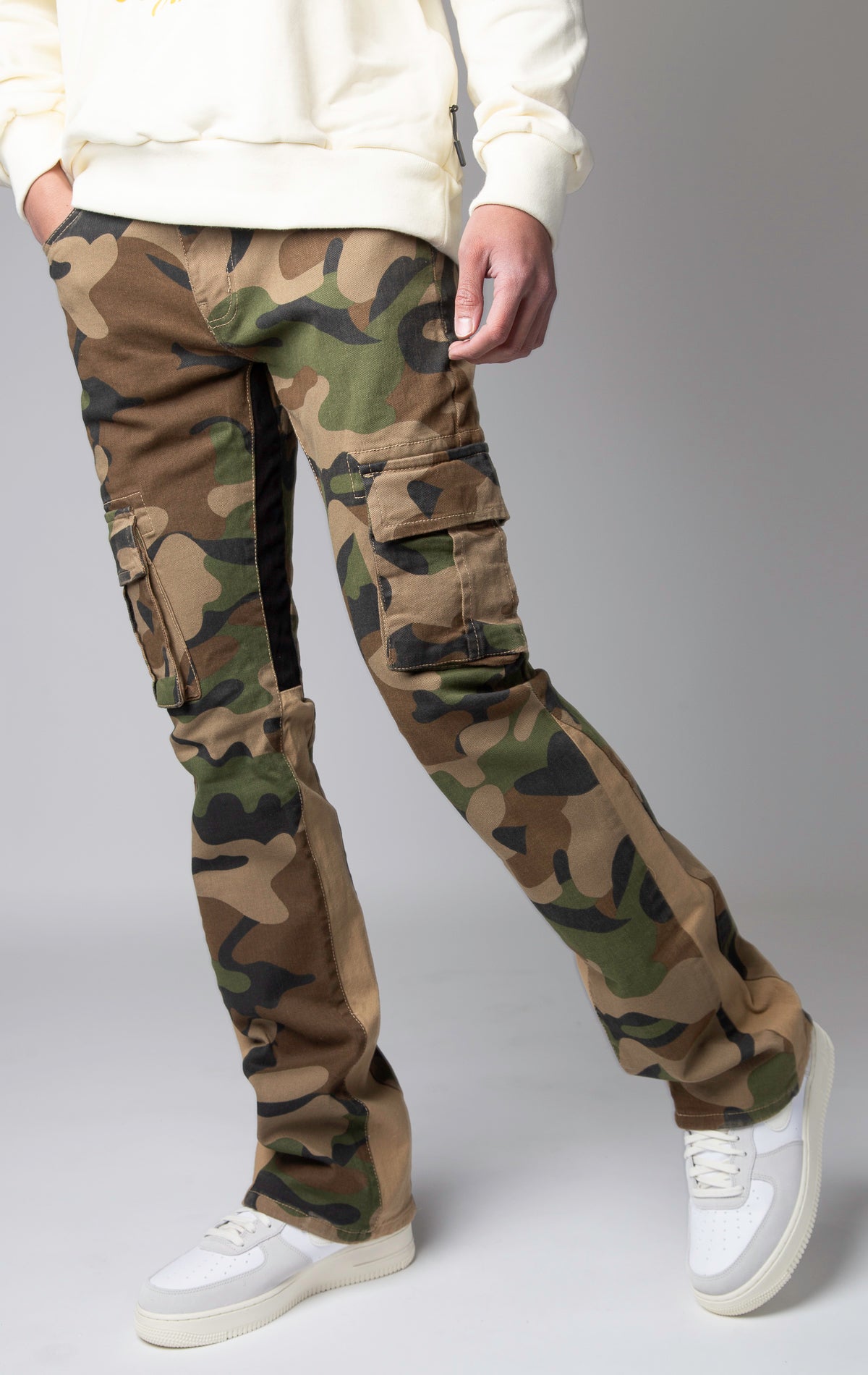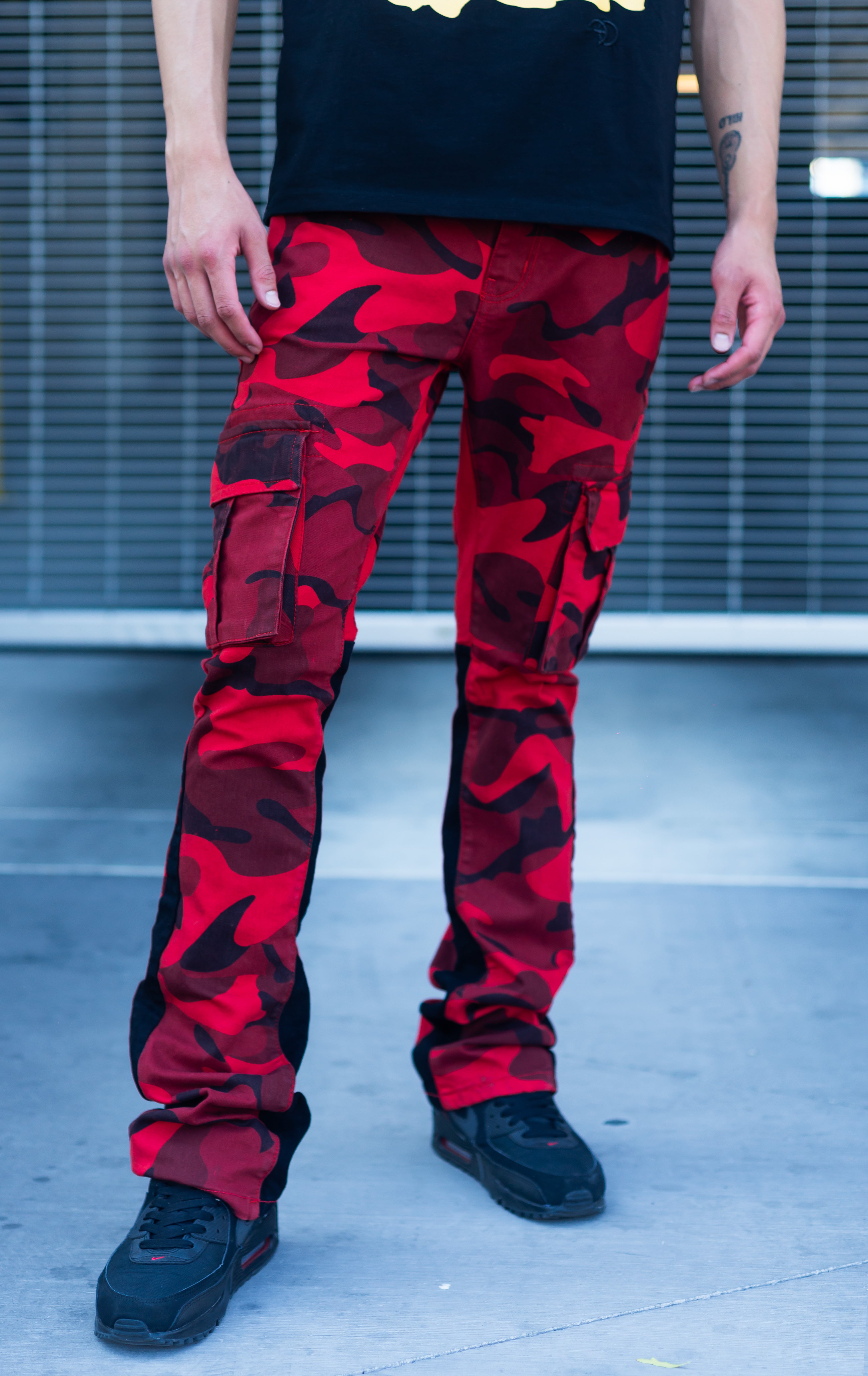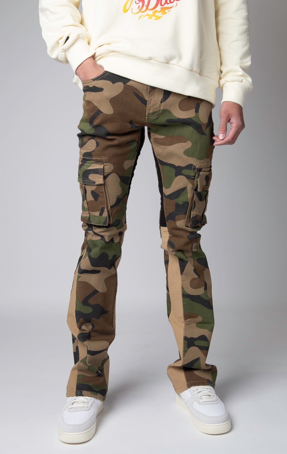Stacked cargo pants in 3 different colors.