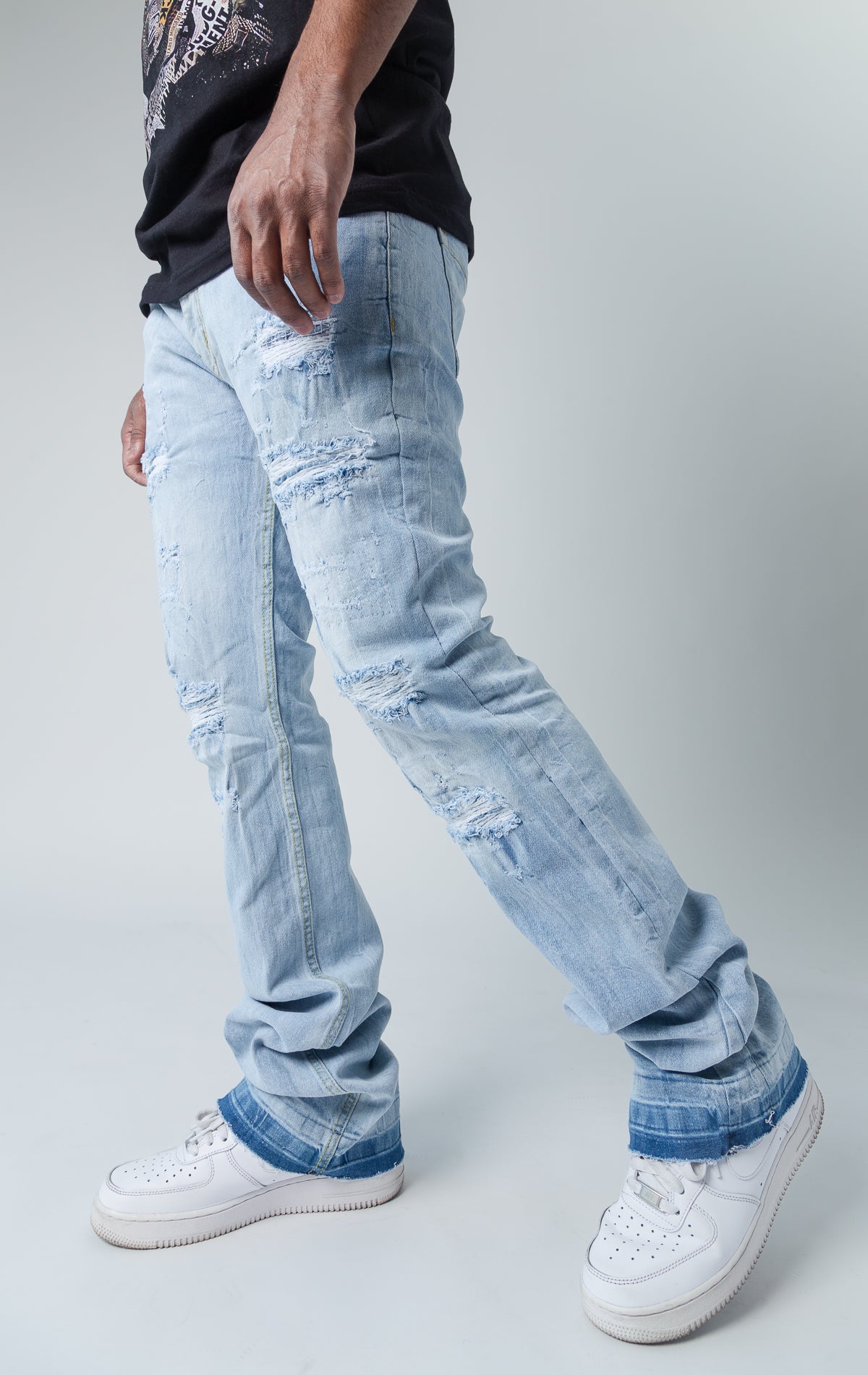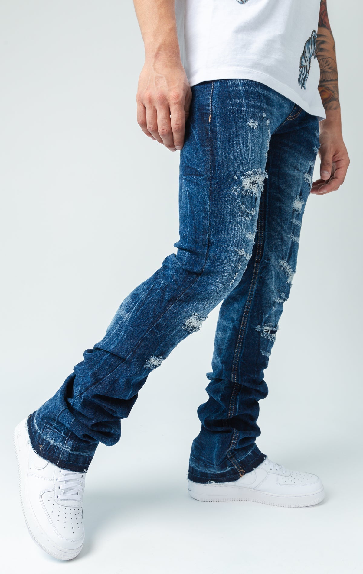 Worn down stacked denim.