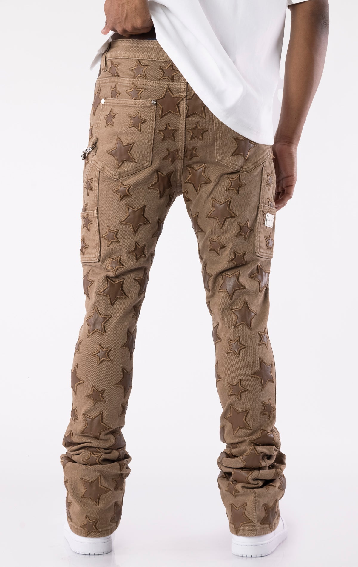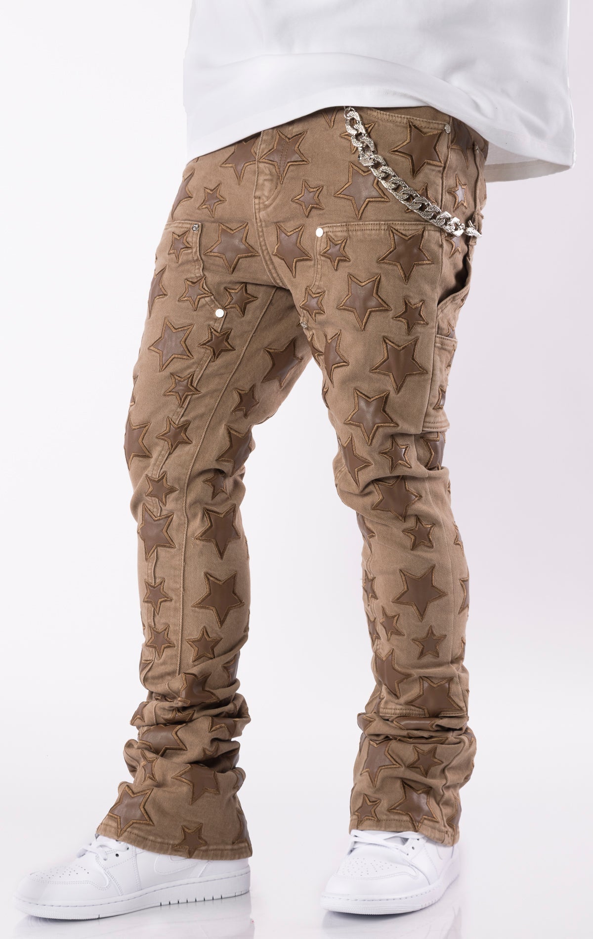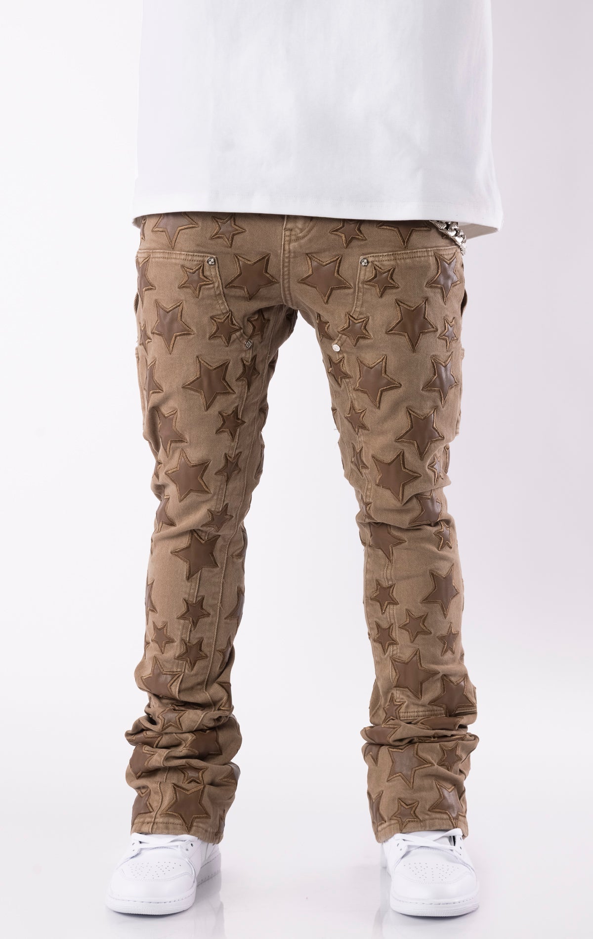 Elevate your streetwear game with the Obsidian Stars Denim, a bold fusion of premium craftsmanship and modern edge. This striking pair of jeans is adorned with meticulously stitched leather star patches across the denim, creating a captivating 3D effect.
