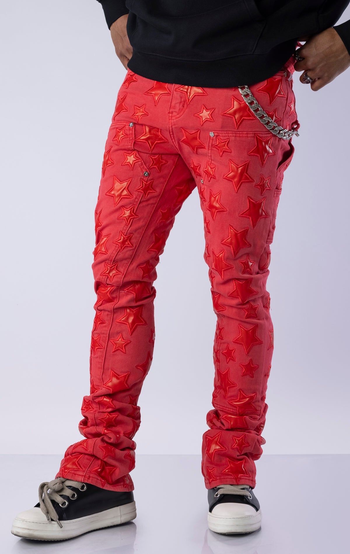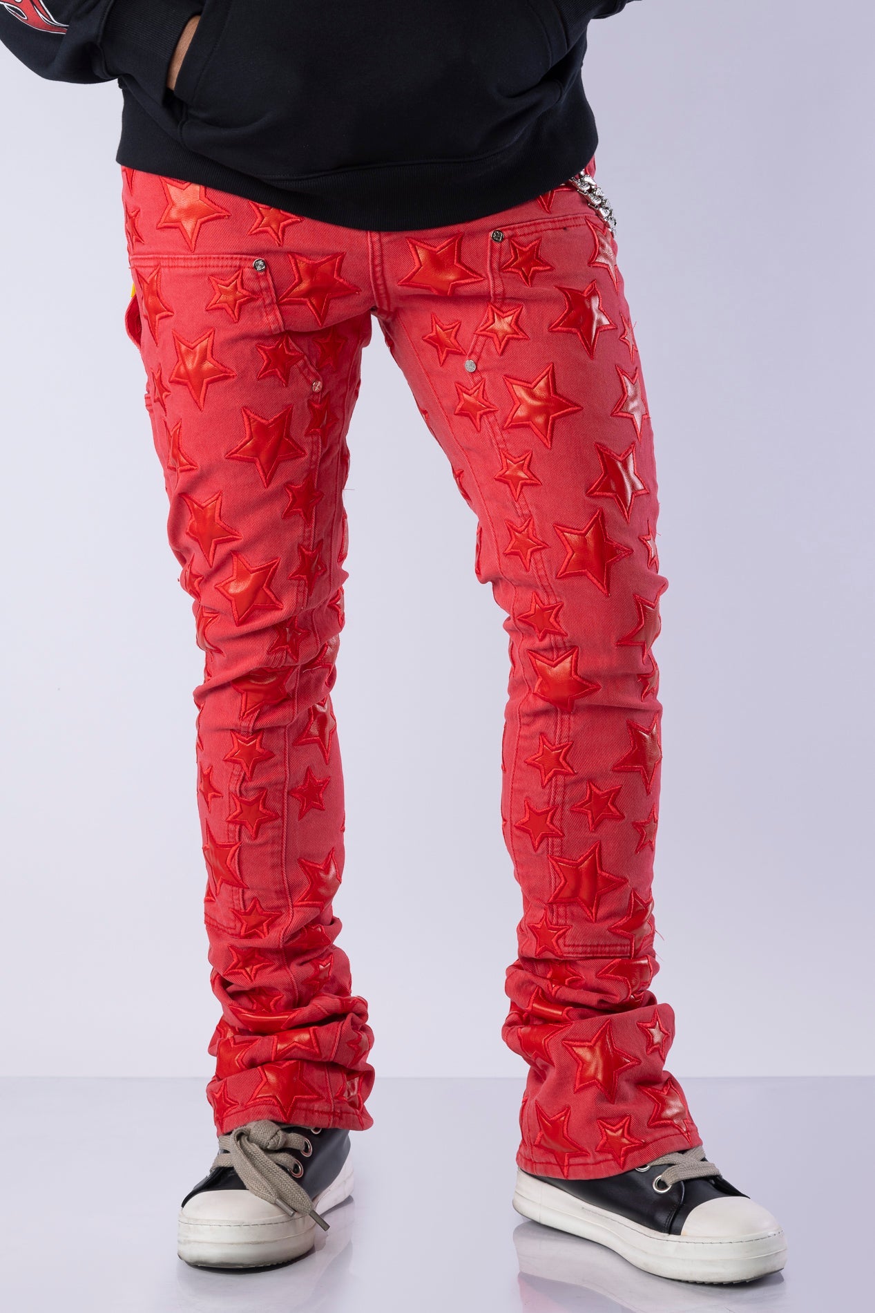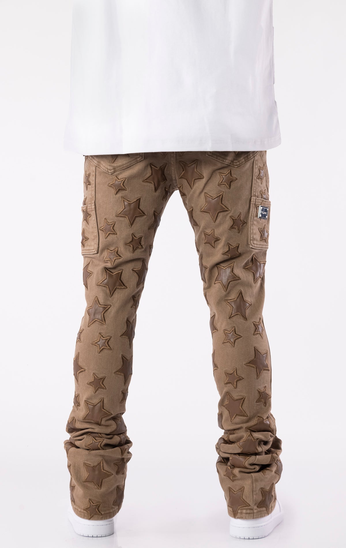 Elevate your streetwear game with the Obsidian Stars Denim, a bold fusion of premium craftsmanship and modern edge. This striking pair of jeans is adorned with meticulously stitched leather star patches across the denim, creating a captivating 3D effect.