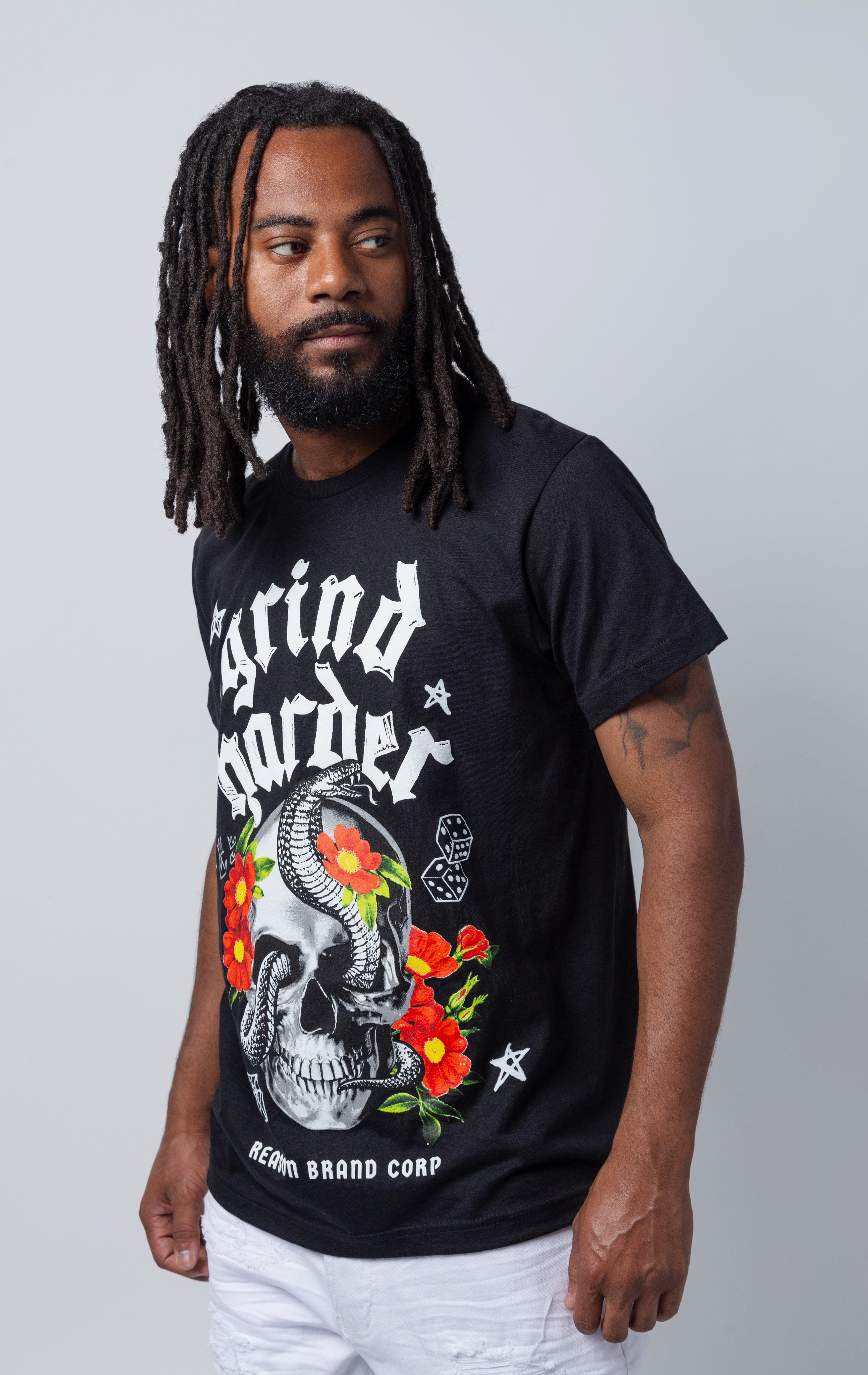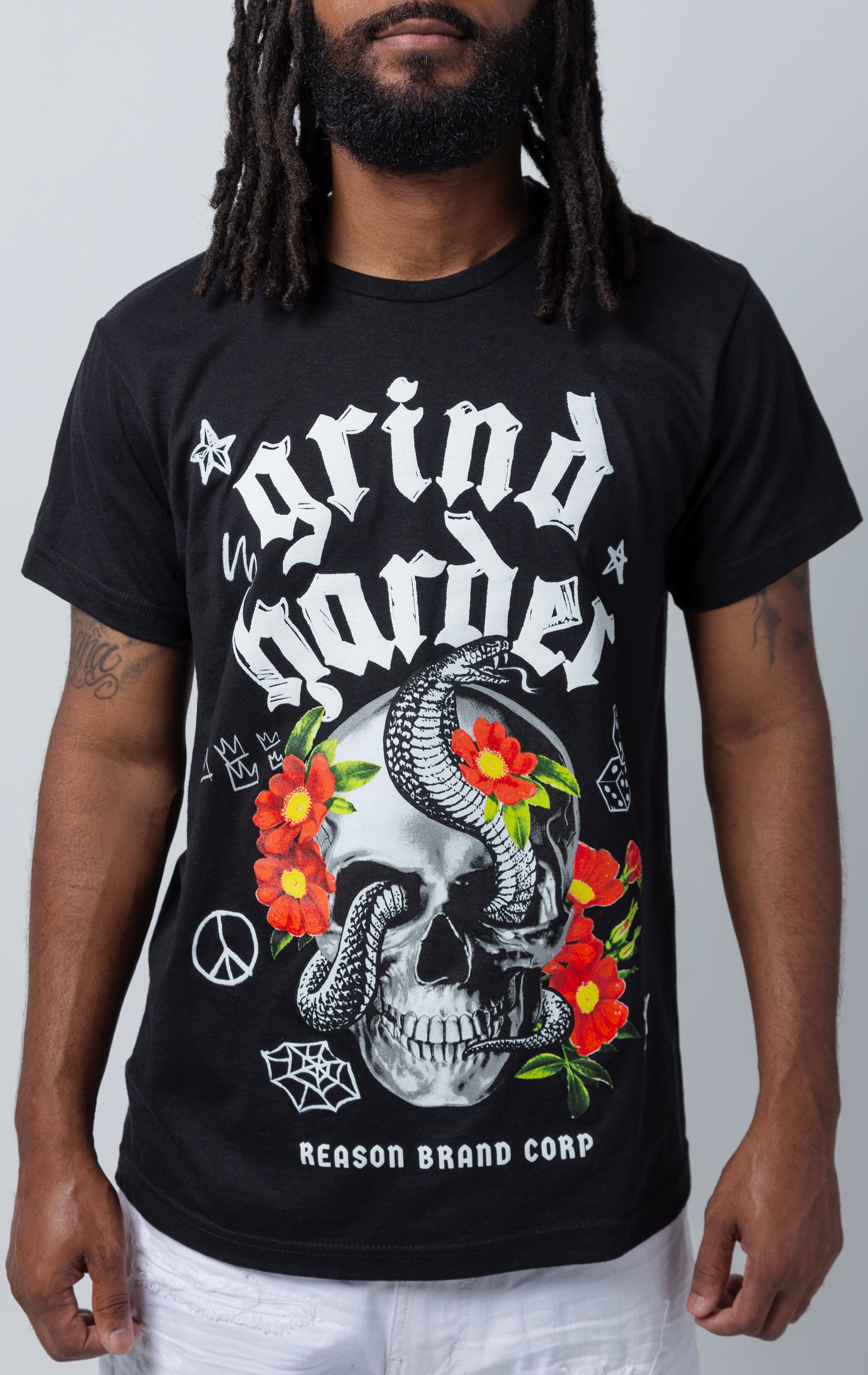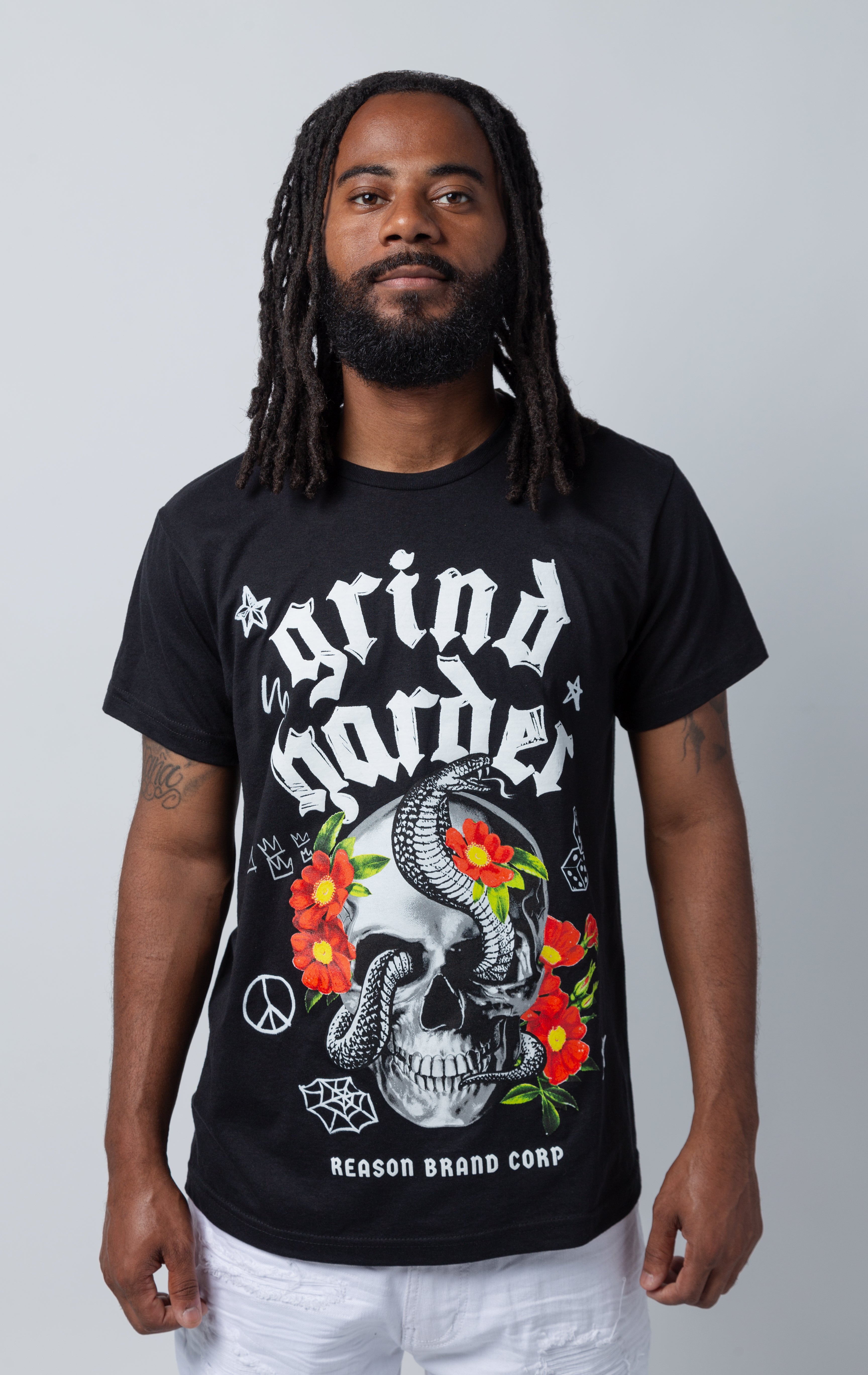 Black t-shirt with Grind Harder graphics. Reason Brand Corp