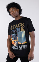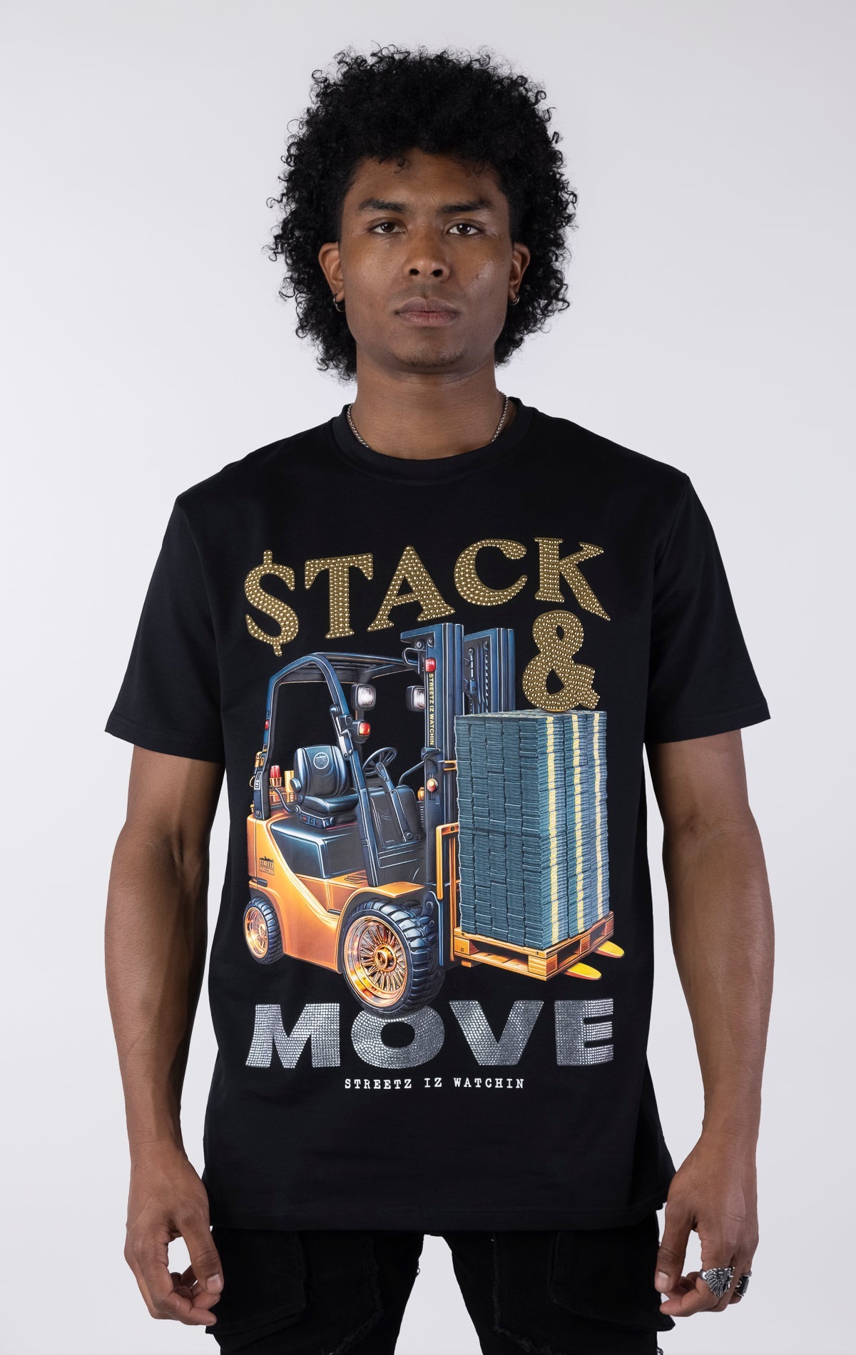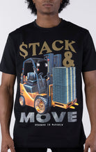 The Stack & Move T-Shirt is a high-impact black graphic tee designed for an assertive street aesthetic. The shirt features a large, detailed illustration of a forklift actively hoisting a towering stack of currency on a pallet. Above and below this bold image, the text “$TACK & MOVE” is rendered in eye-catching, textured gold and silver lettering. Crafted from premium, soft-feel fabric, this T-shirt provides a comfortable, standard fit while making a clear, powerful statement in urban streetwear.