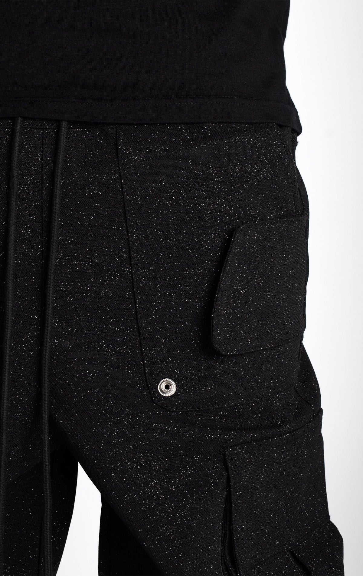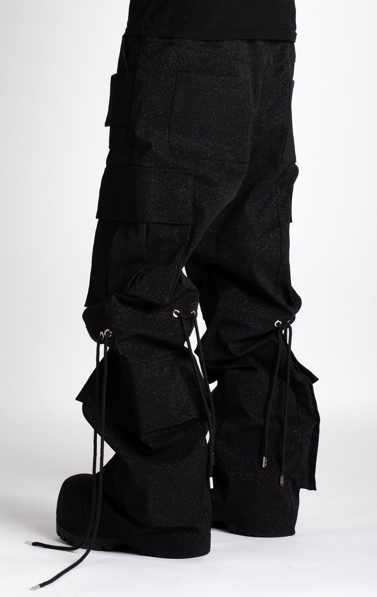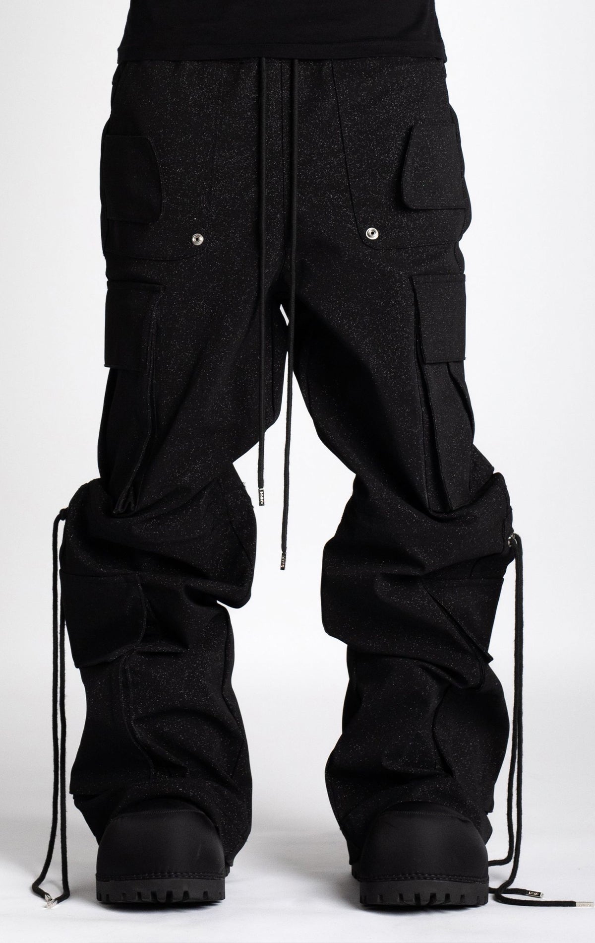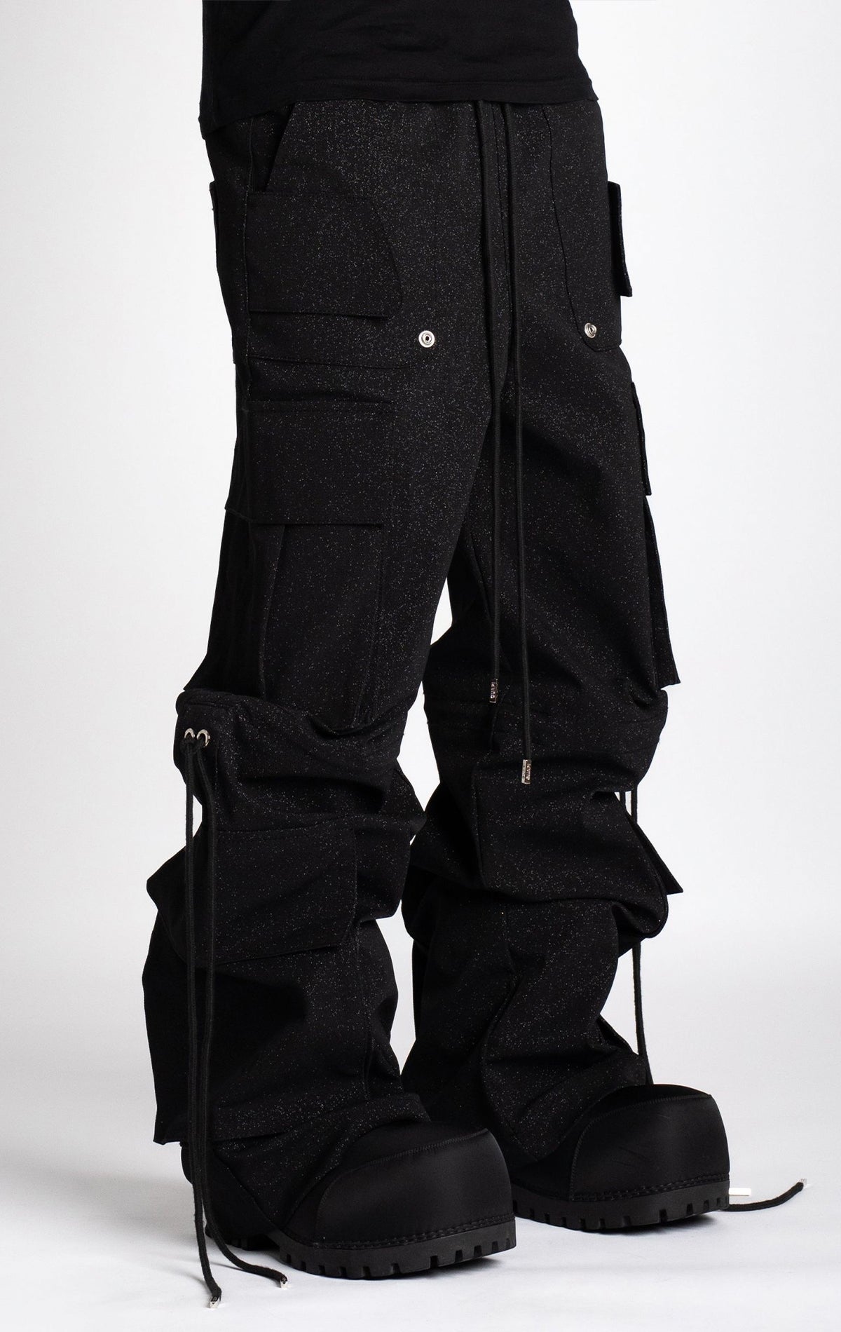 Starry Sky Black Textured Extra Baggy Cargos V2. Features a textured fabric, a loose fit, multiple pockets, adjustable waist and knee drawstrings.