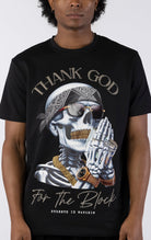 The central design features a stylized skeleton, a powerful symbol of permanence and authenticity, richly adorned with gold accents, sunglasses, a bandana, and statement jewelry. The powerful message, “THANK GOD FOR THE BLOCK” is set in a bold, textured, sparkling font that elevates the look.