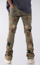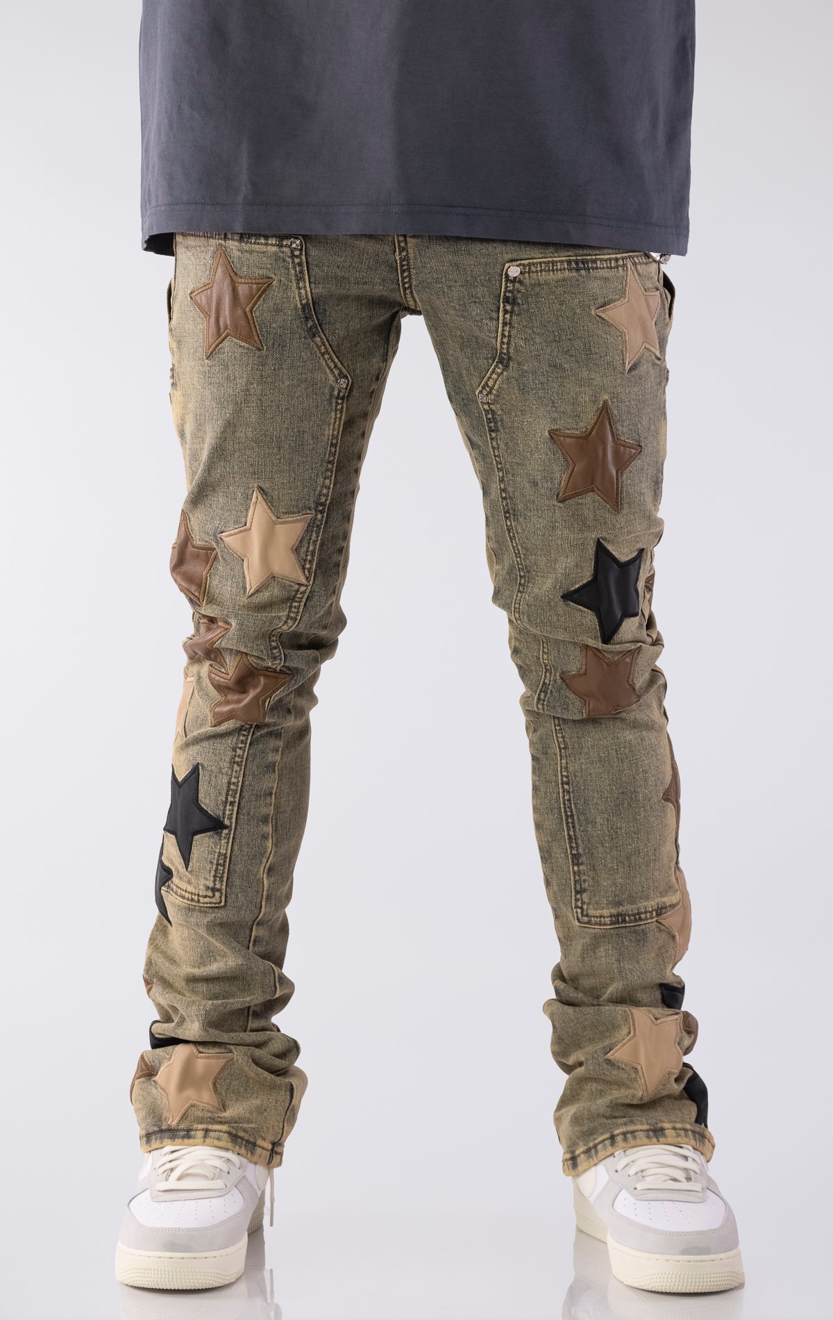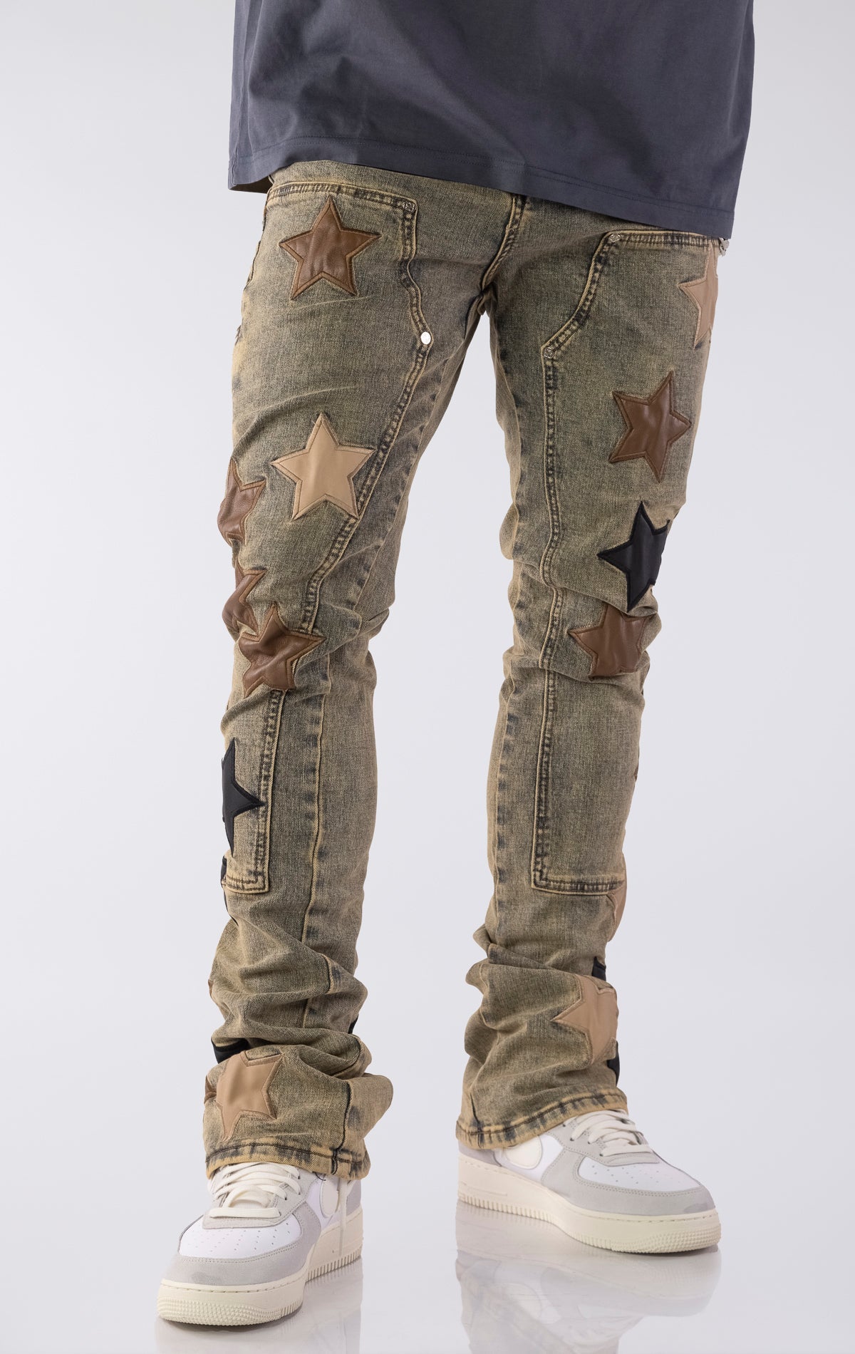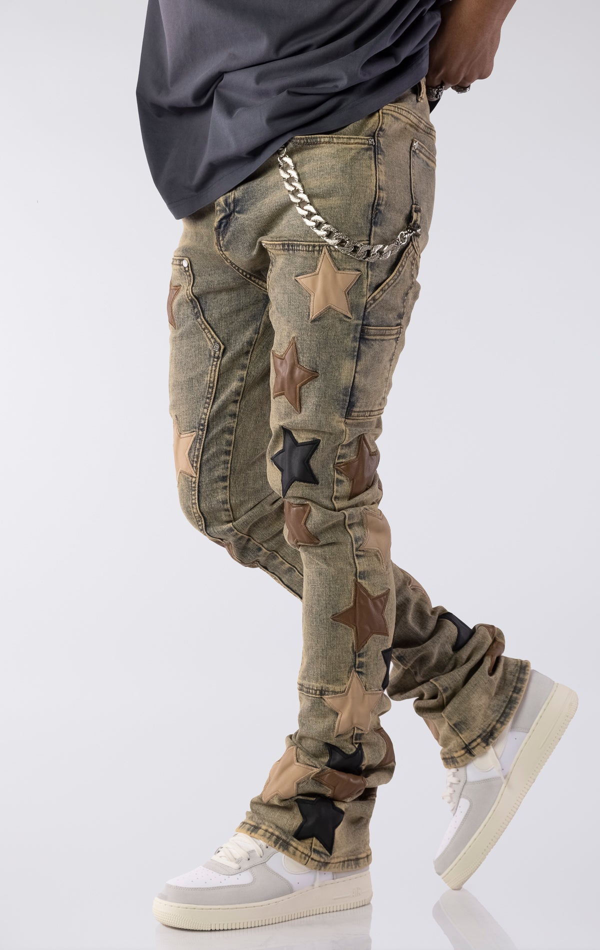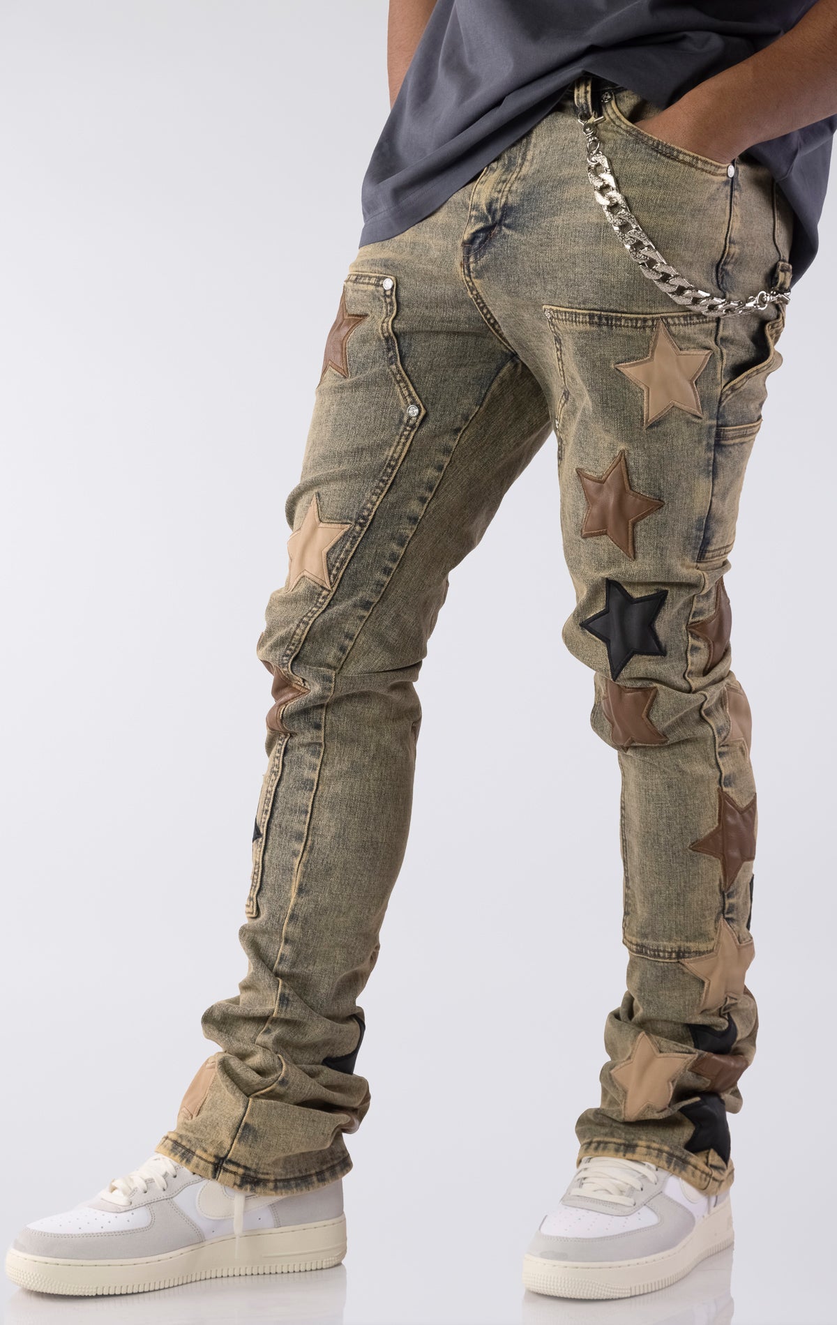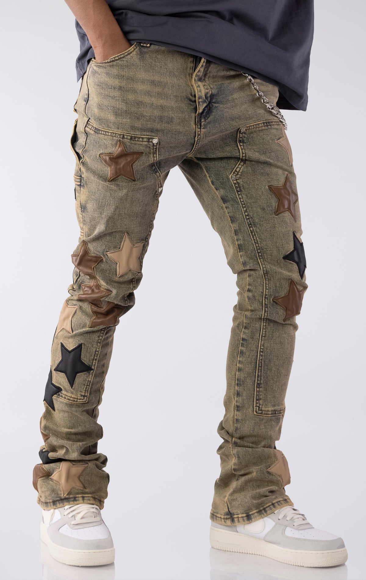 The Vintage Stars Denim V2 combines bold design with elevated craftsmanship. Made from durable denim with a slim, stacked fit, these jeans feature premium leather star patches The handcrafted patchwork adds texture and dimension, while the stacked silhouette ensures a modern, on-trend profile. A removable metal chain accent adds an optional touch of streetwear influence.