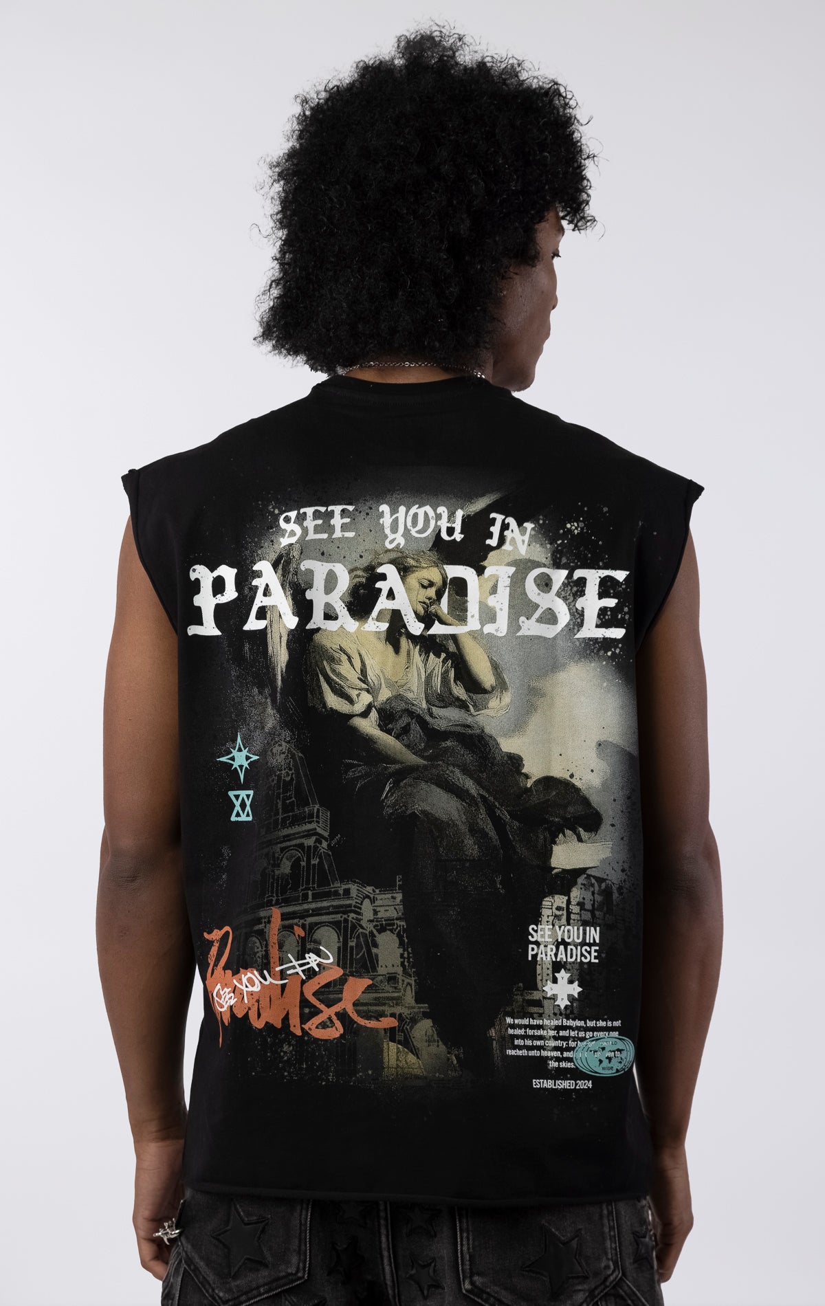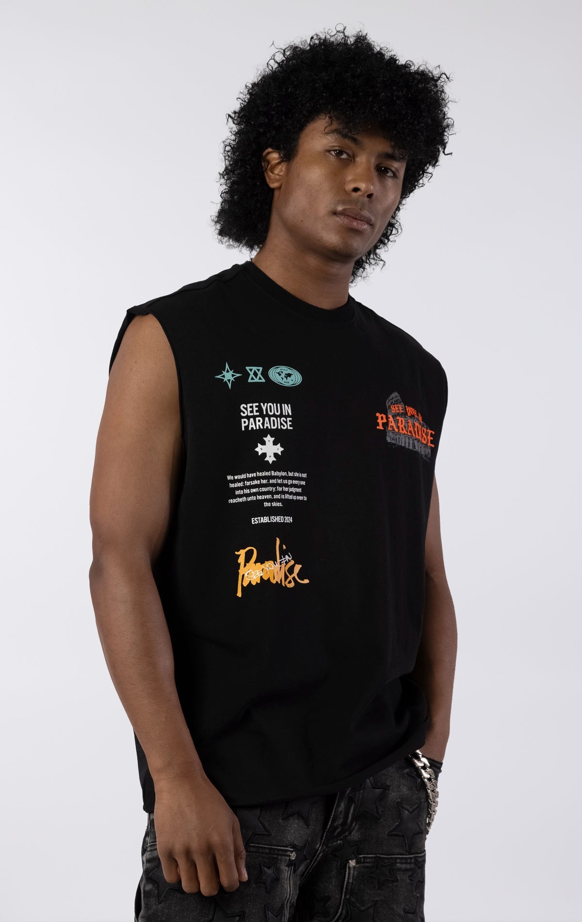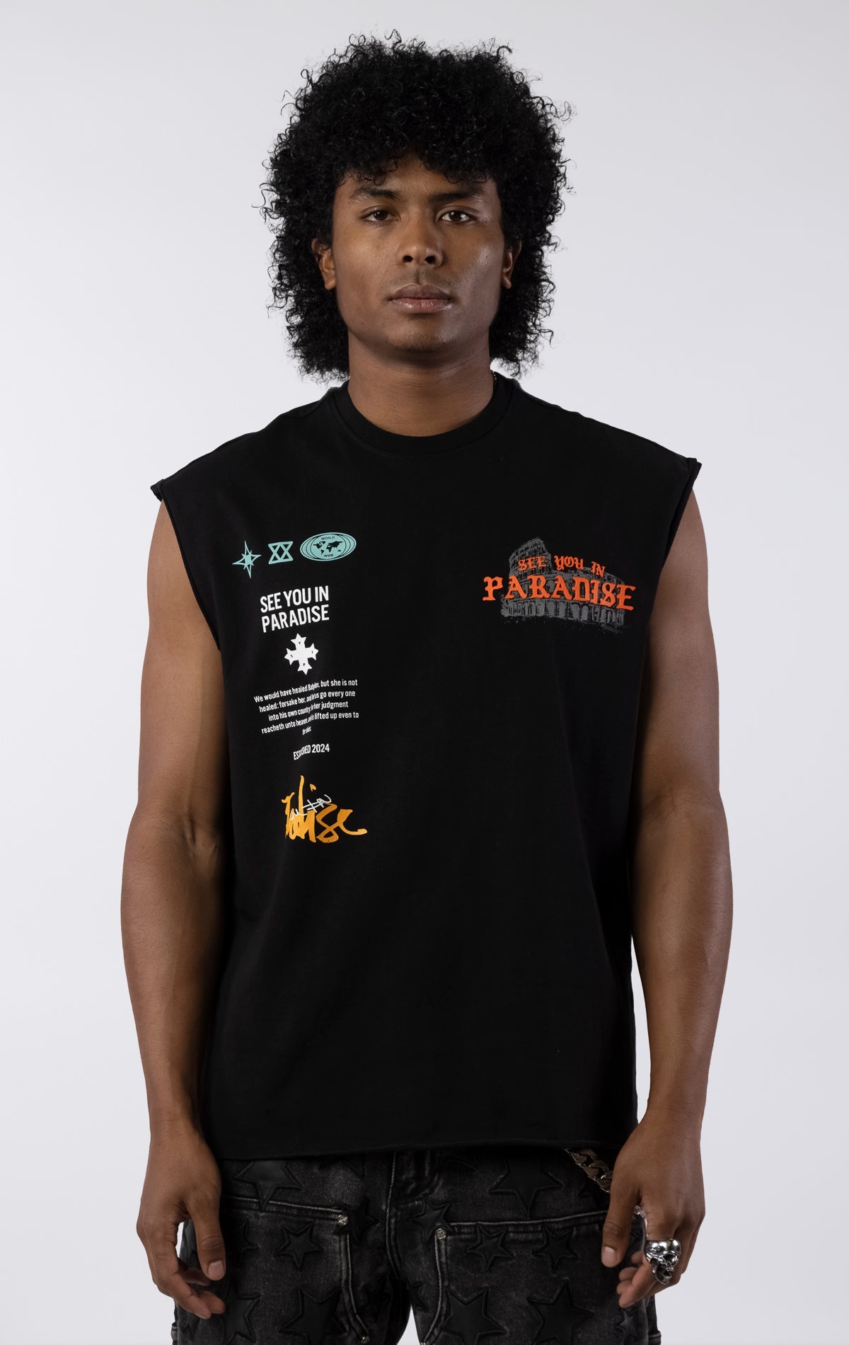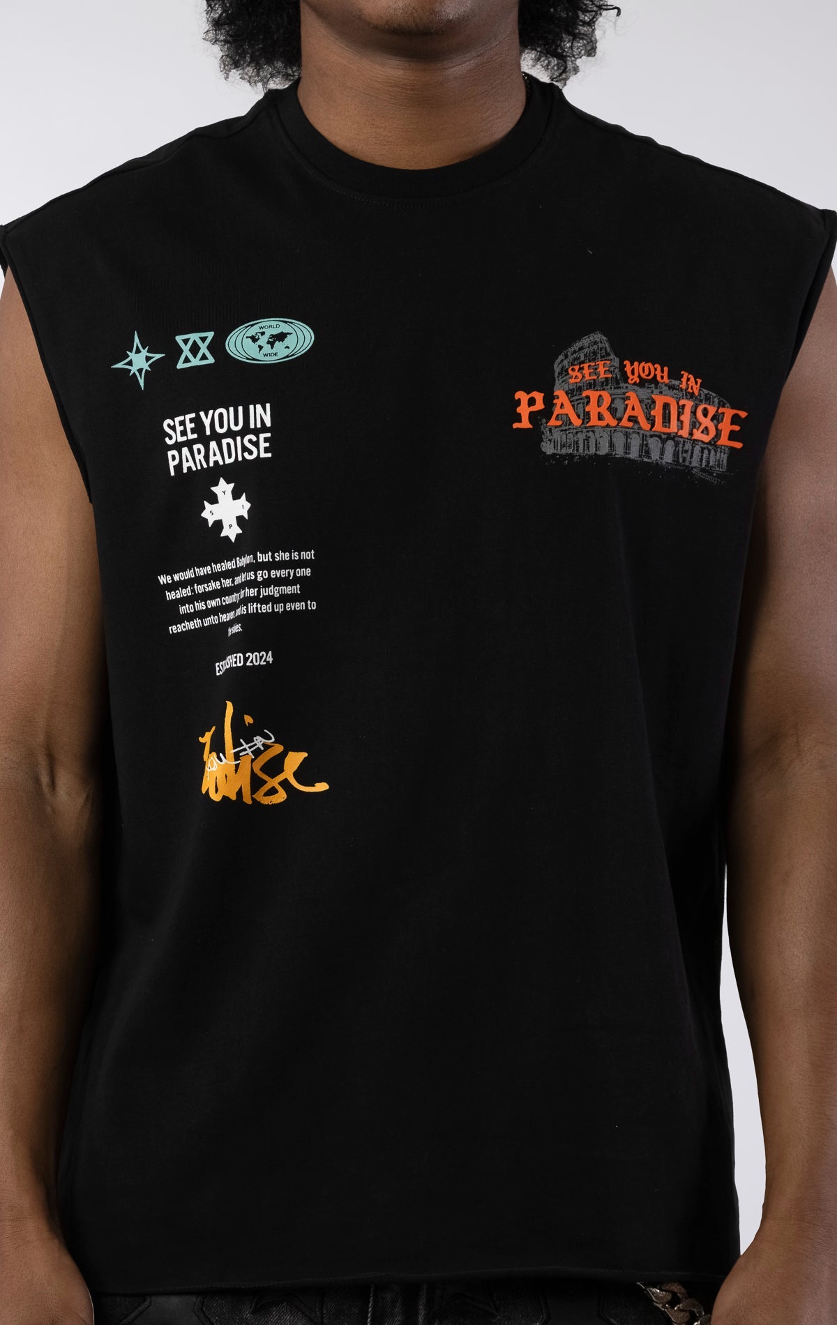 The Worldwide Cutoff T-Shirt makes a complex statement with a collage of iconic graphics and text and a series of cryptic symbols. This black tee is designed with a raw, unhemmed finish on the sleeves and bottom for an authentic, street-ready look. Made from a premium quality 280 GSM jersey, it offers a substantial feel while maintaining a buttery soft hand feel.